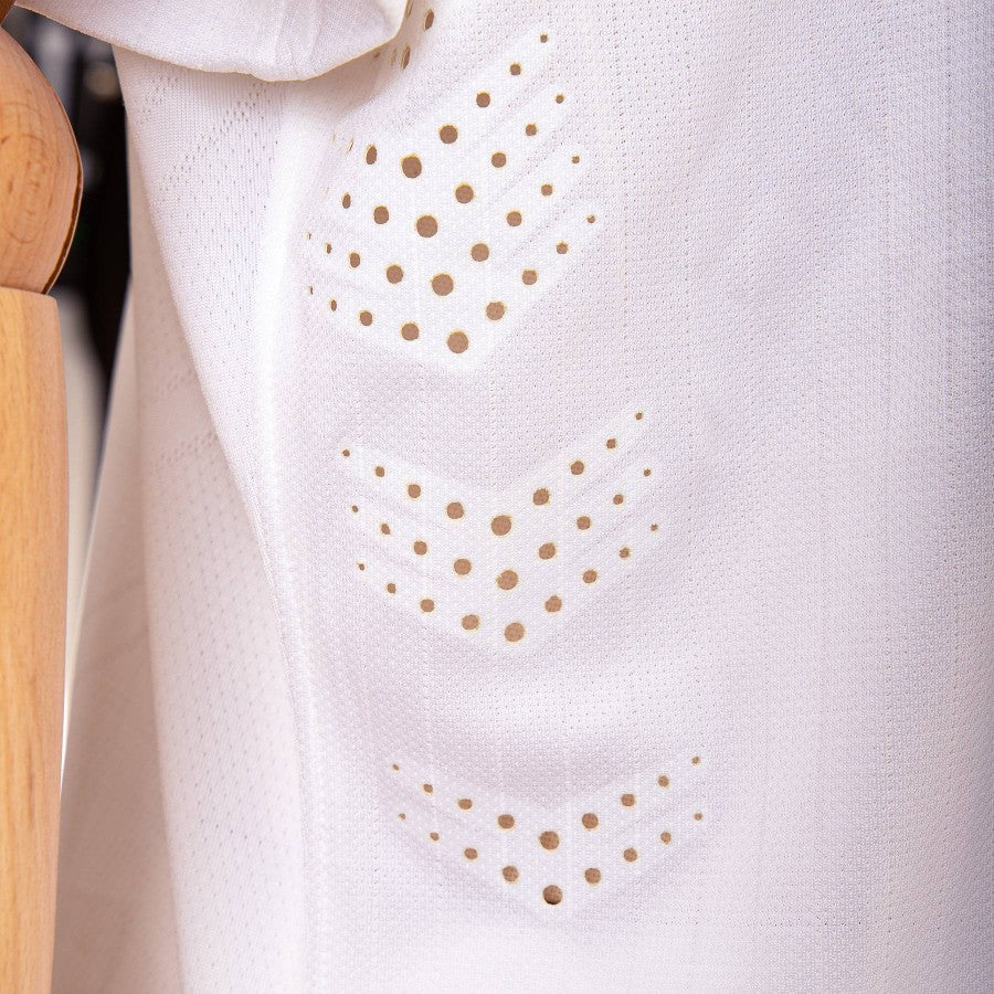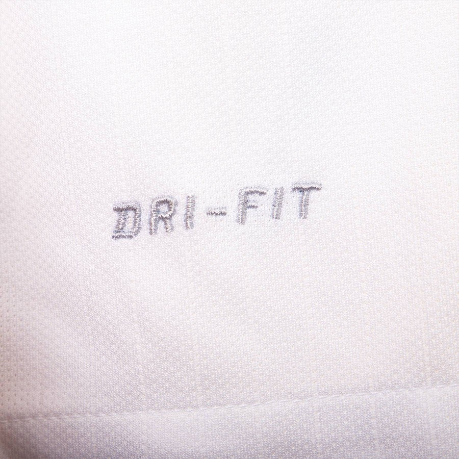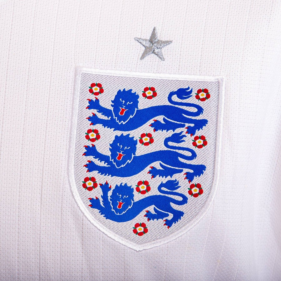 England national team jersey white defender Phil Jones, name and number JONES 5 printed on the back in blue. V-neck, Federation logo sewn on heart side, Nike logo embroidered on right side.