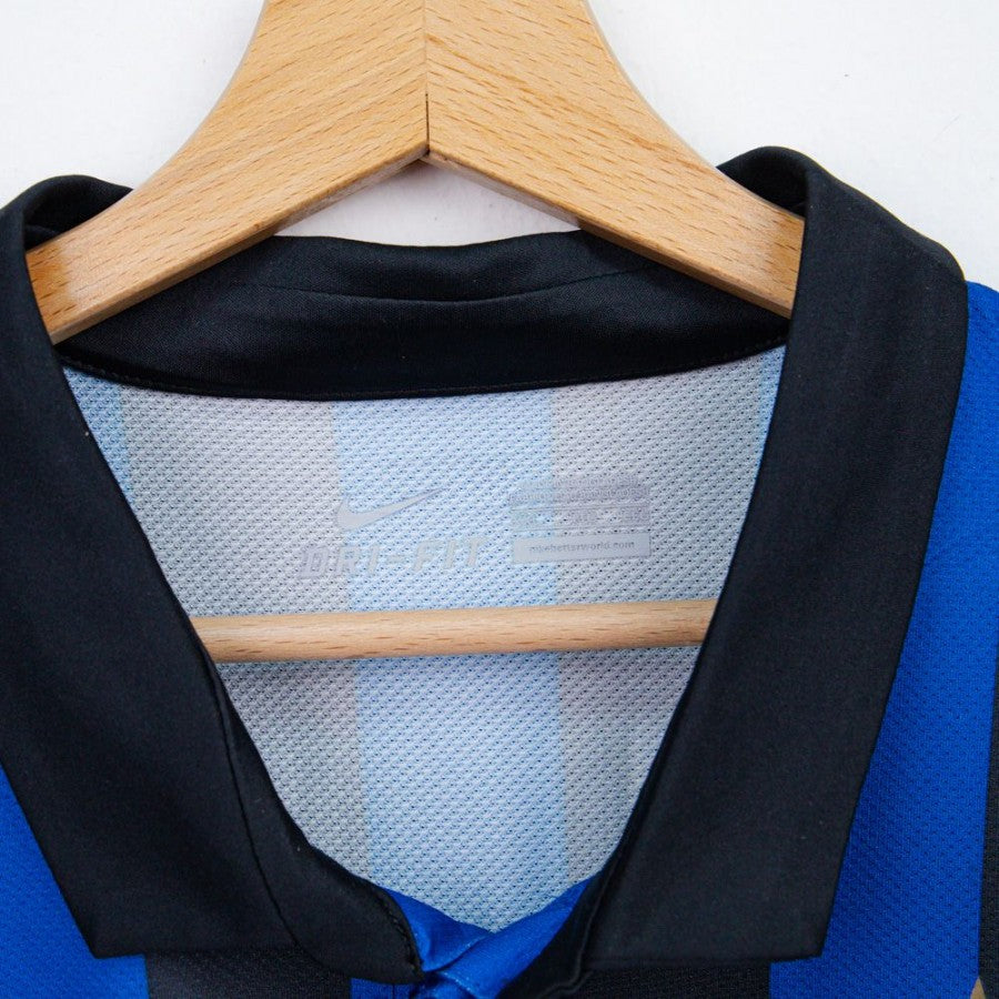 Home short-sleeved match shirt black and blue Inter season 2011/2012. On the front we find: the Italy Cup patch sewn on the right side, just below the technical sponsor logo Nike applied, on the heart side a particular team logo thermo-applied with the writing NERAZZURRI inside the shirt, the commercial sponsor Pirelli applied, the label AUTHENTIC sewn on the bottom. On the back: MILITO lettering and number 22 applied in white, INTER lettering applied in white on the back neck. On the right sleeve is sewn the original patch Serie A Tim.