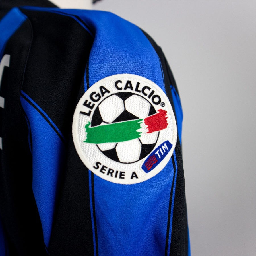 Inter home match shirt of the season 2003/2004 with the Inter logo sewn on the heart side and the Nike logo embroidered on the right. In the center there is the Pirelli logo applied while on the back you can see the number 7 and the lettering Andy Van der Meyde. The original Serie A patch is sewn on the right sleeve.
