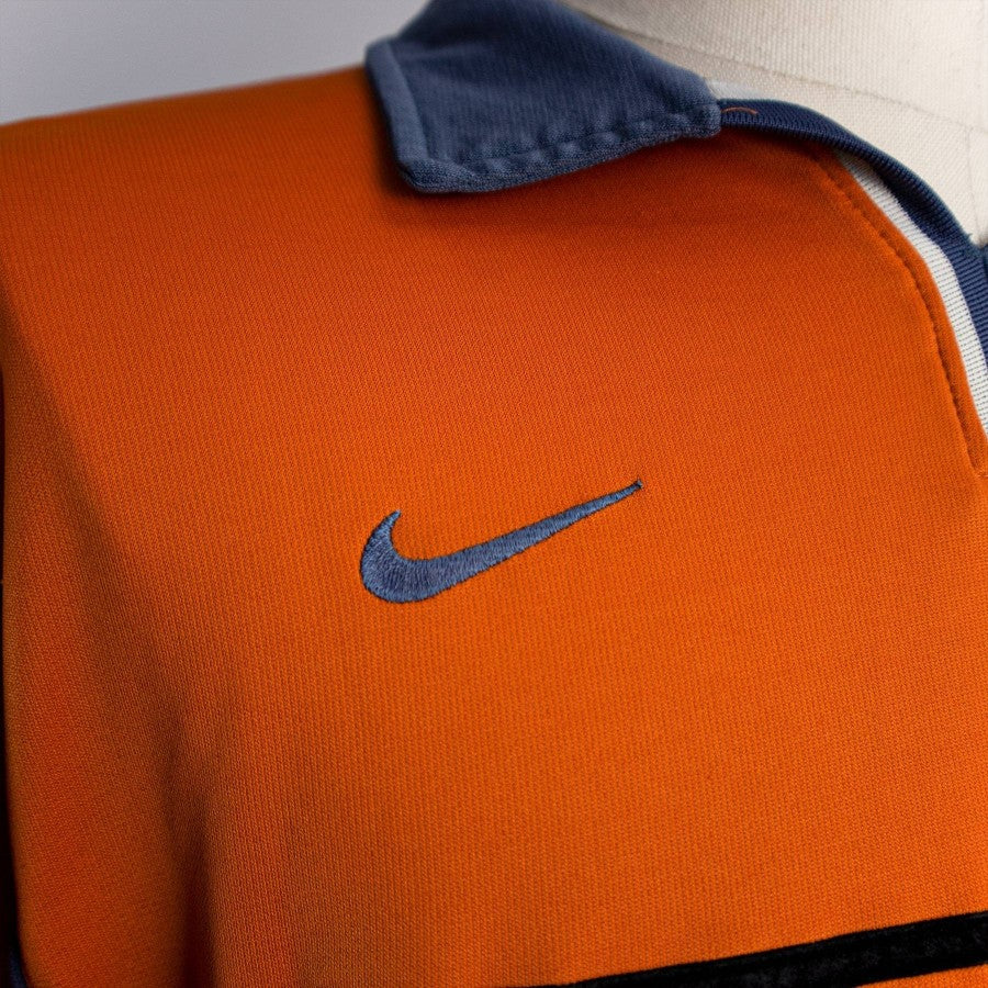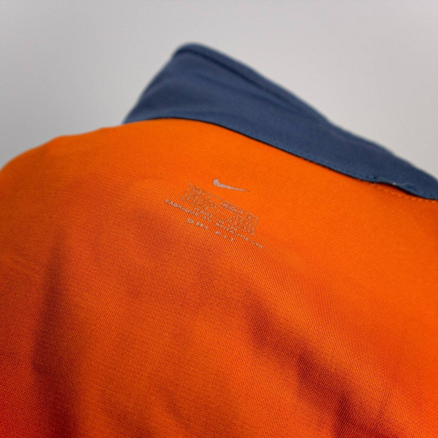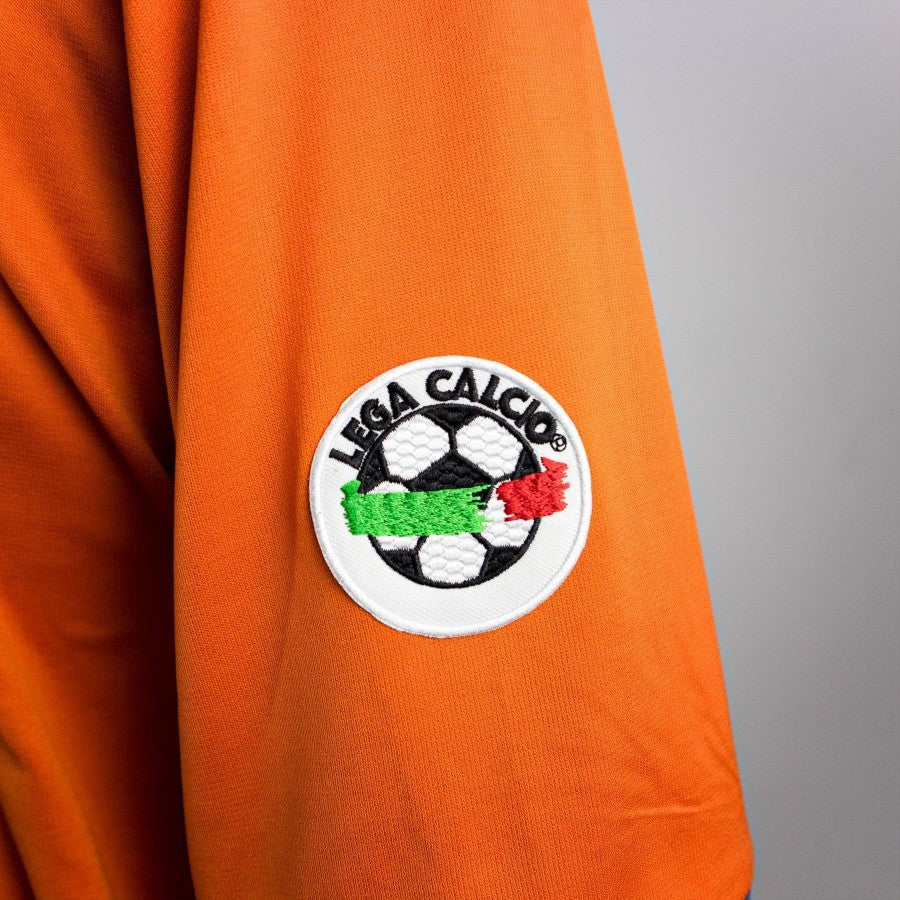 Third shirt of FC Inter orange with white and gray inserts used by the Nerazzurri in the 2000/2001 season. Pirelli commercial sponsor logo flocked, Inter coat of arms sewn silicon side heart. Nike technical sponsor logo embroidered in grey on the right side. Polo collar, Lega Calcio patch on the right sleeve. Uniform is short sleeved. Thermo-applied number 1+8 with "Zamorano" lettering.