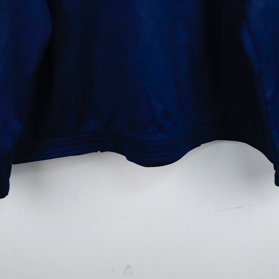 Official Bologna FC sweatshirt for the 2001/2002 season, produced by technical sponsor Macron. This half-zip model features white details on a blue background. The Macron logo and the main sponsor "Area Banca" are displayed on the chest, while the back showcases a large print of the Macron logo and sponsor. The Bologna FC crest is embroidered on the sleeve, making this sweatshirt a must-have for true fans. Size XXL.
