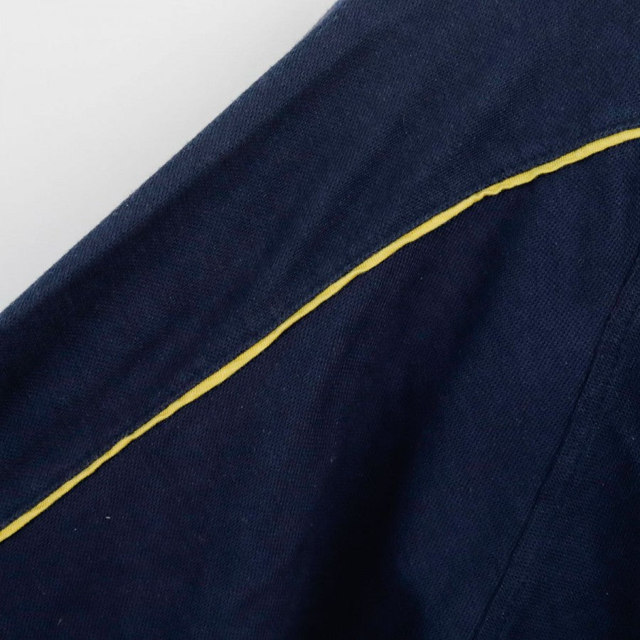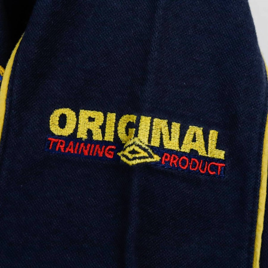 Inter training sweatshirt from the 1997/1998 season made by Umbro. The technical sponsor Umbro appears on the chest and back, while the commercial sponsor Pirelli stands out on the front. The sweatshirt is navy blue with yellow trim on the cuffs and seams, and features the club crest with a star. Size: XL.