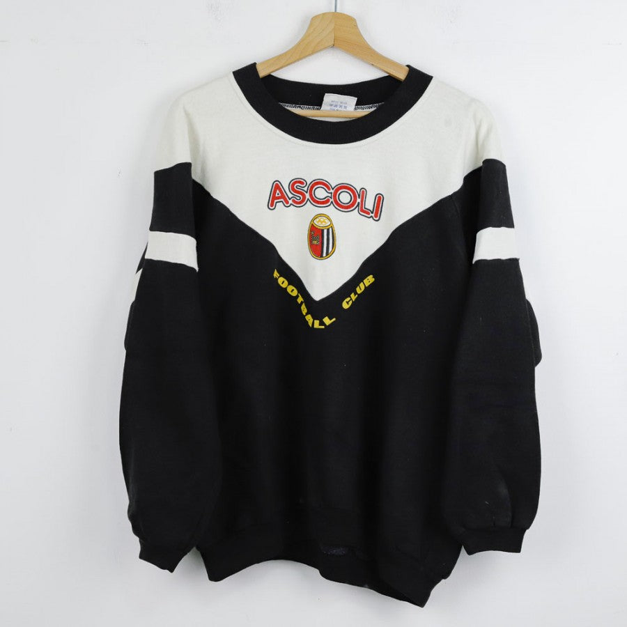 The official Ascoli sweatshirt, part of the "Le Felpe dei Grandi Club" collection in 1990, is a vintage piece celebrating the legacy of the Marchigiano team. Made in size L, it features a black-and-white color scheme with a distinctive V design on the chest. The Ascoli Calcio crest is embroidered at the center, accompanied by the "Ascoli Football Club" lettering in red and yellow, symbolizing the team. The sweatshirt, crafted from soft fleece fabric, ensures comfort and warmth, making it ideal for collectors and nostalgic fans.