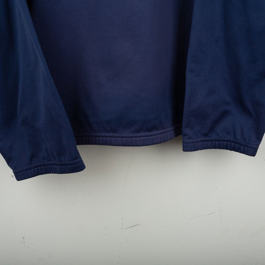 Bologna FC 1909 sweatshirt from the 2001/2002 season made by Macron. Navy blue half-zip model with central “BOLOGNA FC 1909” lettering applied on the chest. Macron and AreaBanca logos printed on the front and back. Bologna FC crest embroidered on the left sleeve. Half-zip front with customized Macron puller. Comfortable fit, suitable for training and leisure. Size XL. Official Macron product, Bologna FC technical supplier.