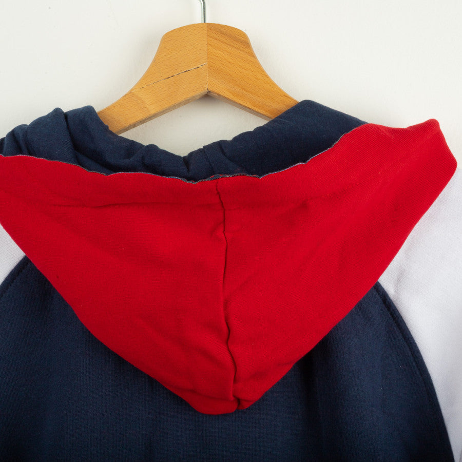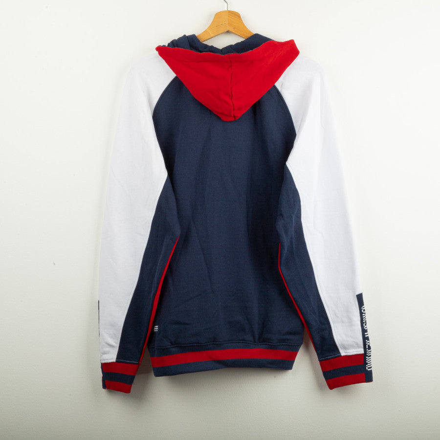 Cagliari Calcio hooded full-zip from the 2022/2023 season by Eye Sport. Navy with white sleeves and red inserts. Embroidered Eye logo on right chest, heat-applied rubber club crest on left. Lined red hood with drawstrings, full front zipper, side pockets, and ribbed cuffs and hem with red-navy stripes. Soft interior. Cotton/poly blend. Size M. Official product.