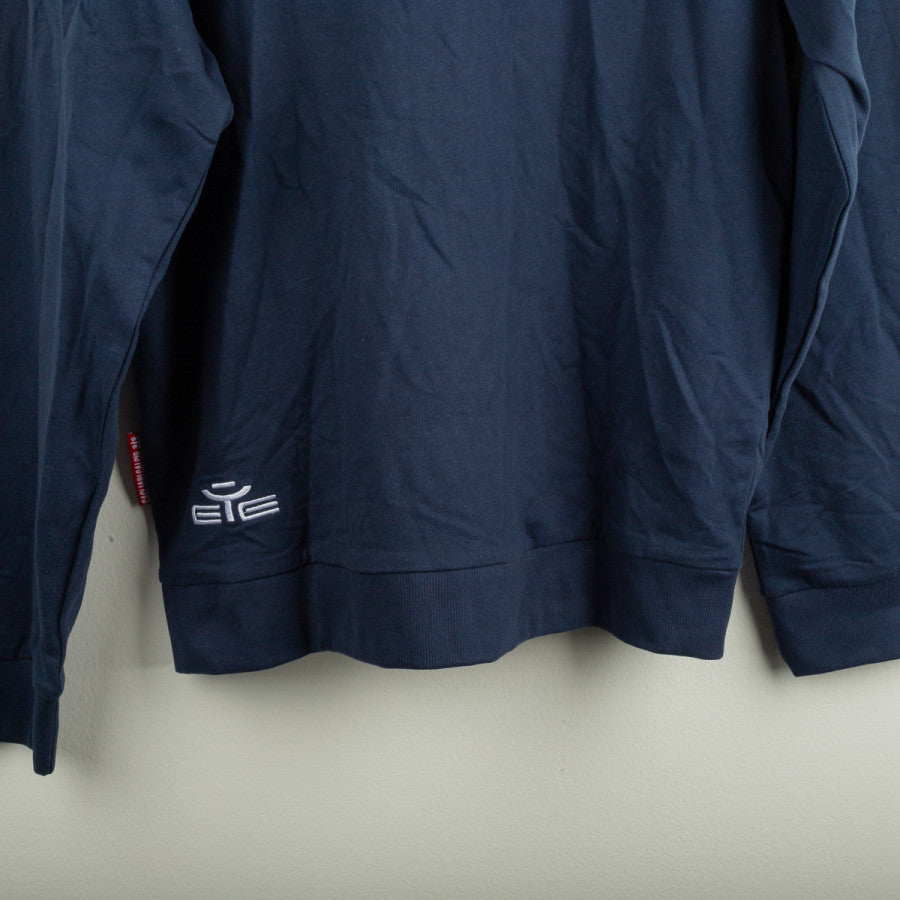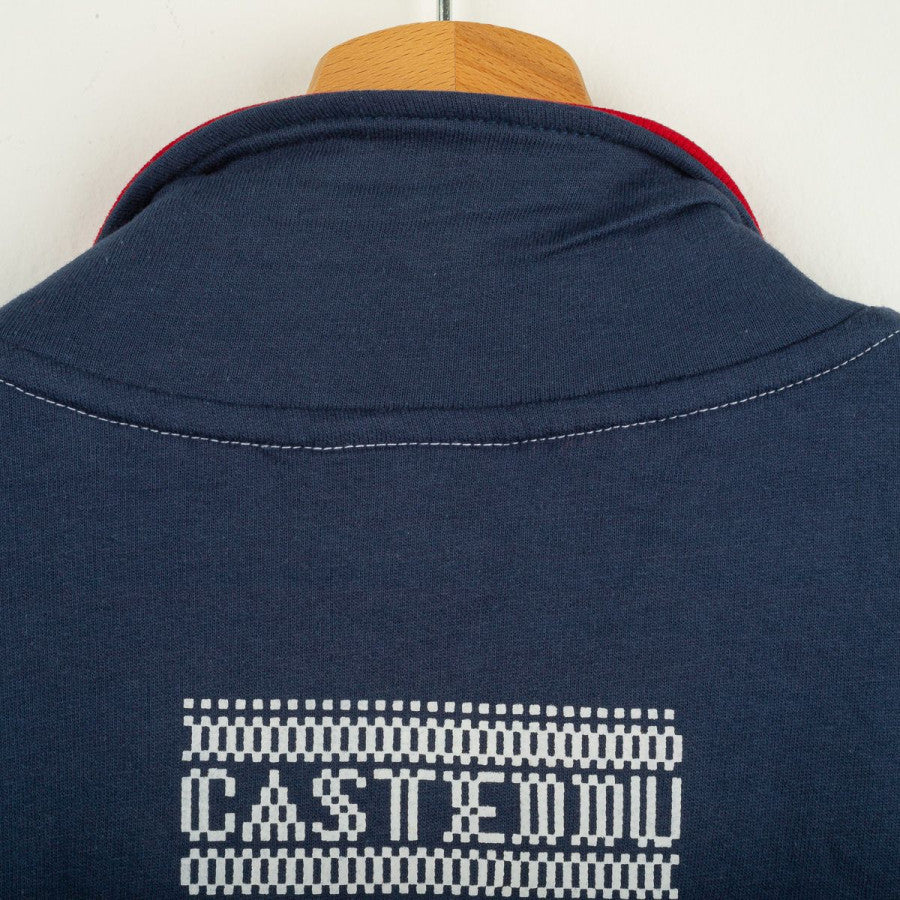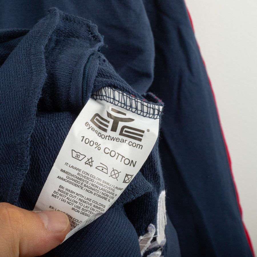 Cagliari Calcio full-zip hoodie from the 2022/2023 season, made by Eye Sport. Navy blue with red and white details. Embroidered Eye Sport logo on the right chest and stitched Cagliari club crest on the left. Full front zipper with branded pull and side pockets. Elastic cuffs and hem for a comfortable fit. Cotton and polyester blend, perfect for training or casual wear. Size M.