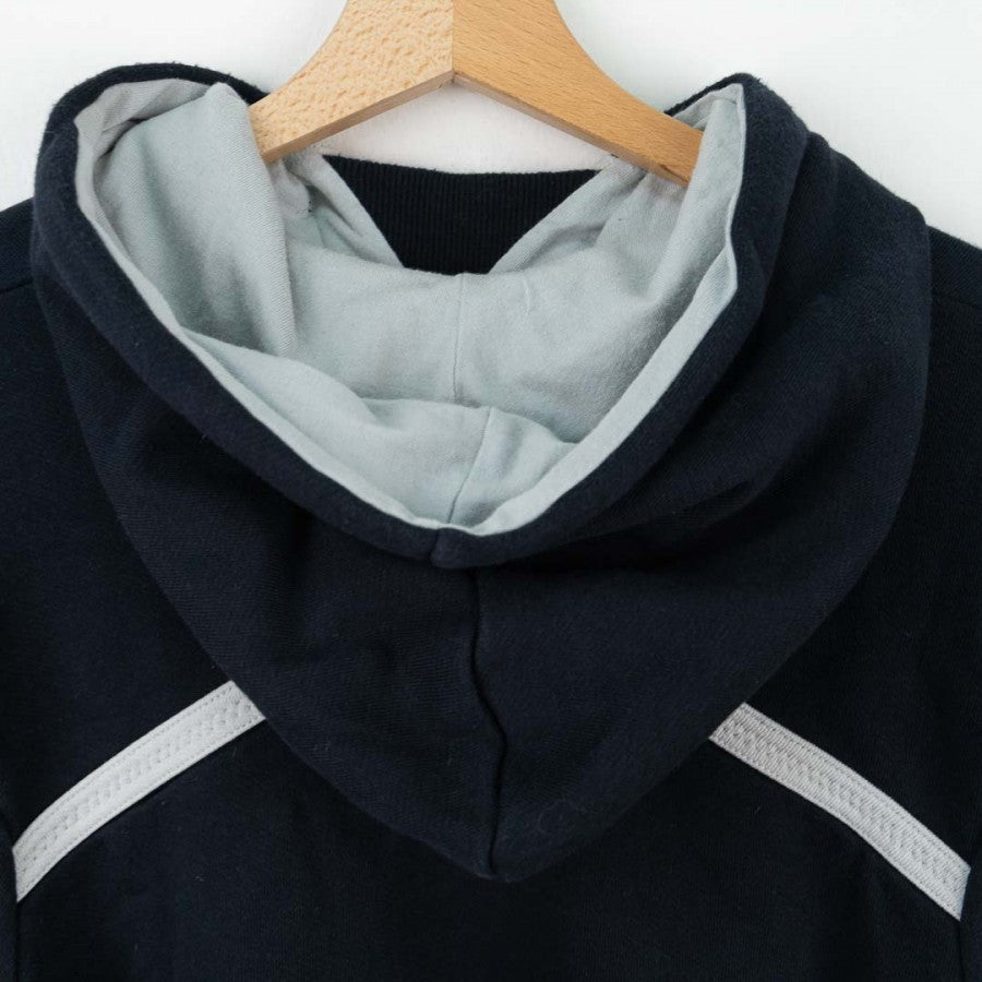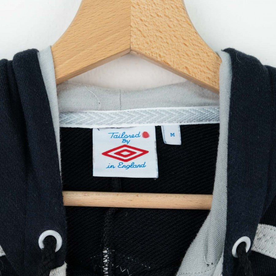 Official England national team hoodie from the 2010/2011 season, produced by technical sponsor Umbro. The hoodie features a dark navy base with light grey inserts on the shoulders and inside the hood. On the left chest is the embroidered FA crest with the iconic Three Lions, while the right side bears the Umbro logo. It includes a drawstring hood, kangaroo pocket, and ribbed cuffs. Size M, as marked on the “Tailored by Umbro in England” inner label.