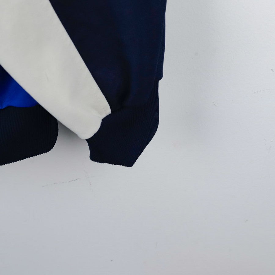 Official jacket of the Italian National Football Team, 1990 season, produced by technical sponsor Diadora. The jacket, in azure blue with white and navy details, features the embroidered Diadora logo on the right chest and the FIGC crest on the left side. The design is completed by iconic white and blue checkered patterns on the shoulders and bold graphic details on the sleeves. Size XL, perfect for collectors and passionate fans of National Team memorabilia. This piece represents the elegance and style of the Azzurri during the iconic Italia '90 World Cup.