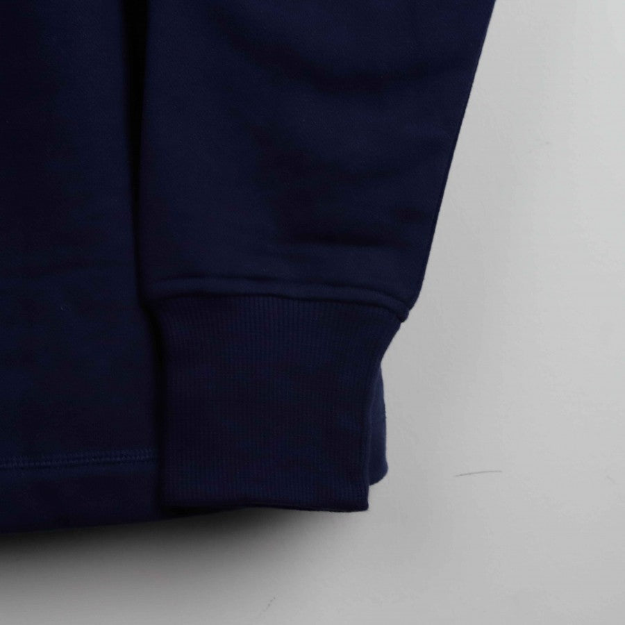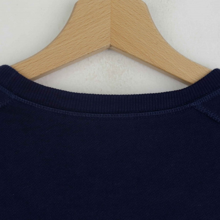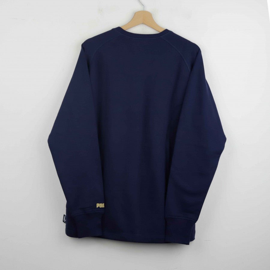 Official Italy National Team sweatshirt from 2004, produced by technical sponsor Puma. In navy blue, it features the FIGC crest stitched on the left chest with three stars above, symbolizing the three World Cup titles won at the time. The Puma logo is embroidered in gold on the left sleeve. Made of soft cotton, this sweatshirt offers comfort and style, perfect for Azzurri fans. The size shown in the images is M.