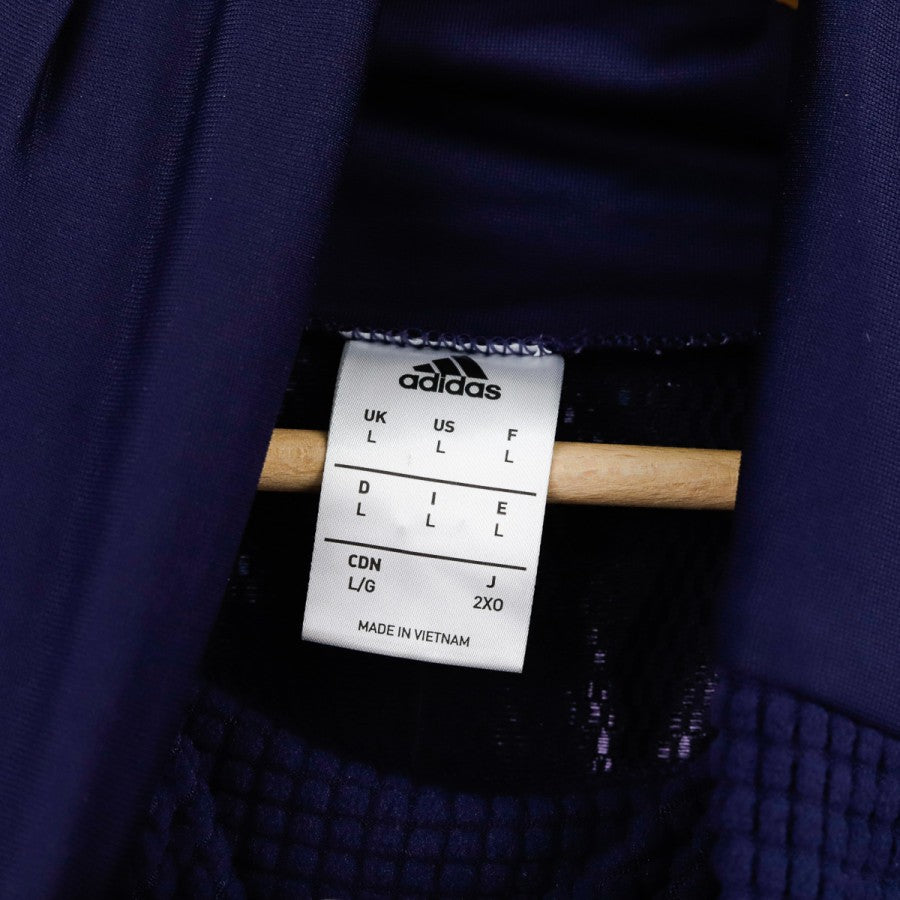 2018/2019 Juventus Adidas 7 Training Sweatshirt made of technical navy blue fabric with purple shoulder details. Features the Adidas logo and number 7 in fluorescent yellow on the chest, alongside the club's modern crest. The design includes a high collar for warmth, making it ideal for training in colder conditions.