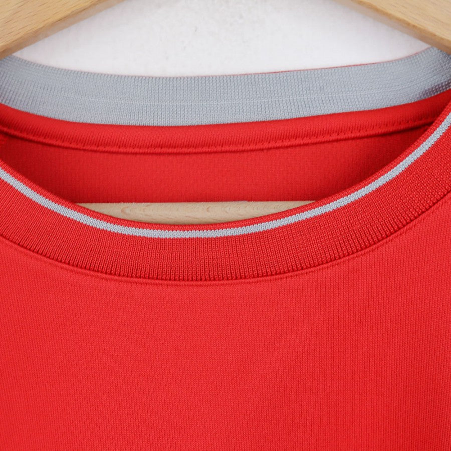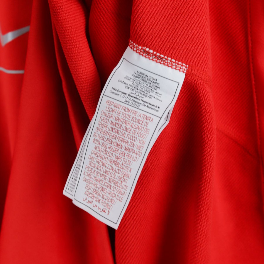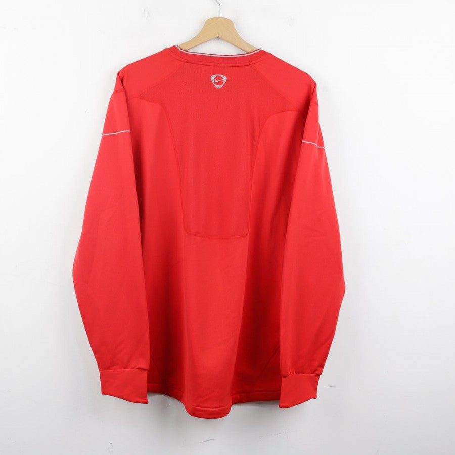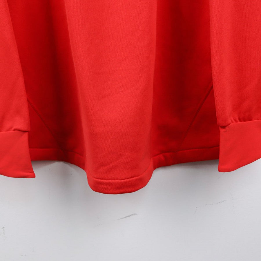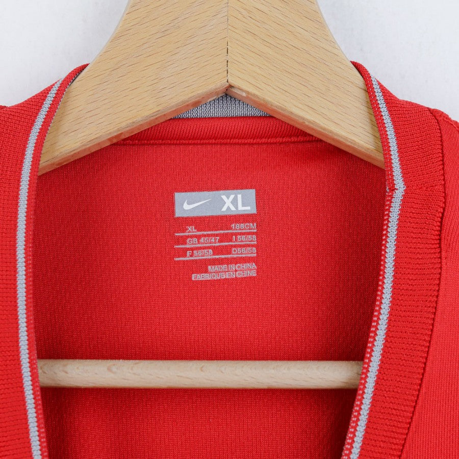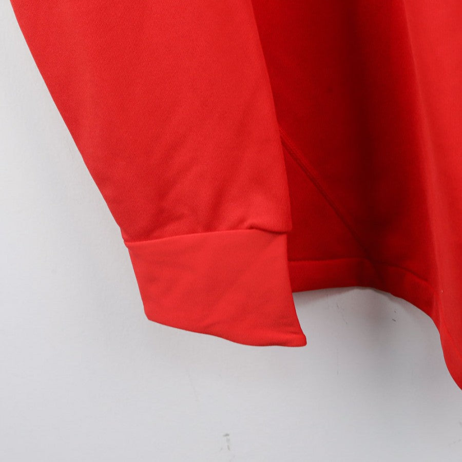 Official Juventus sweatshirt made by Nike for the 2008/2009 season. The design features a vibrant red color with thin grey details across the chest and sleeves. The left chest showcases the Juventus crest, while the Nike logo is embroidered on the right side. The back includes a small Nike detail under the collar. This crewneck model with elastic cuffs ensures a comfortable and snug fit. Size XL.
