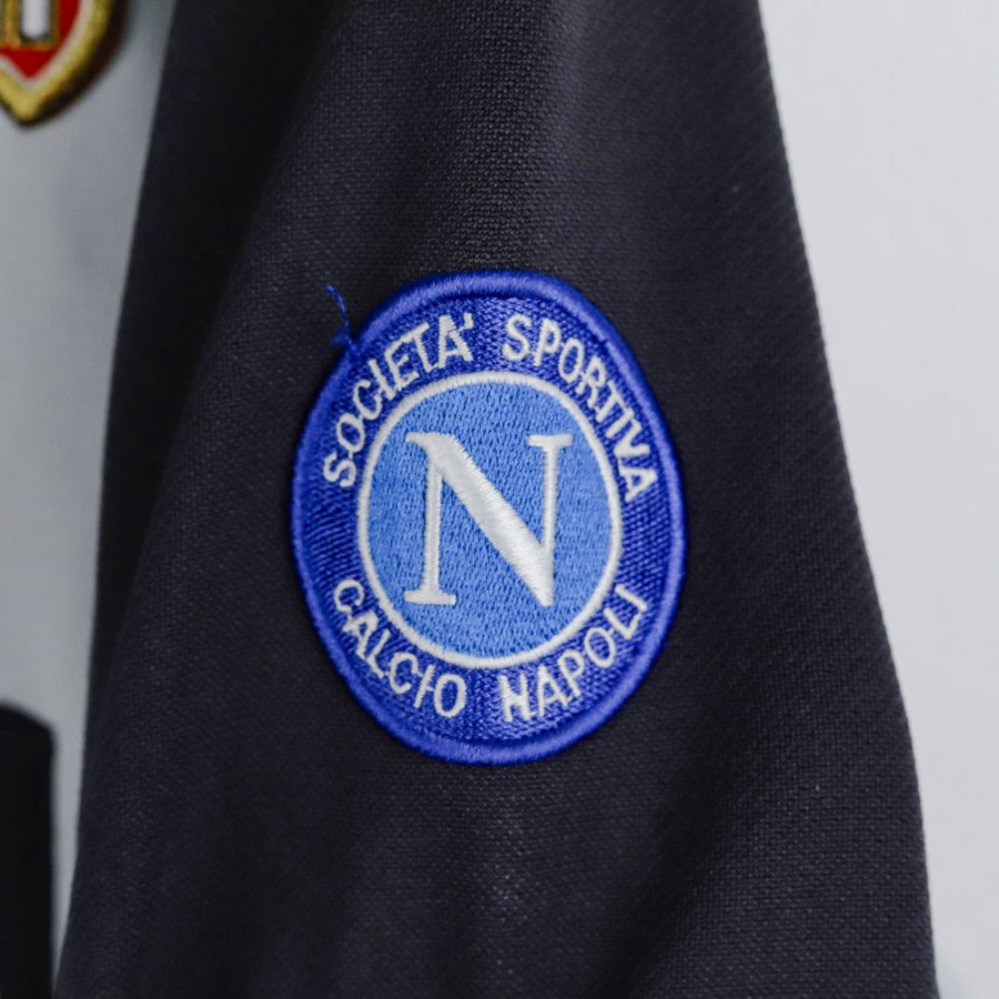 Official Napoli sweatshirt from the 2002/2003 season, produced by technical sponsor Diadora. This gray sweatshirt with black sleeves features light blue details on the sides and a short front zipper. On the chest, the SSC Napoli crest is visible alongside the Diadora logo and commercial sponsor Peroni. The "SSC Napoli" lettering is prominently displayed across the center. On the back, the Diadora logo and Peroni sponsor are embroidered in large size. This sweatshirt represents one of the pieces worn during a challenging season for Napoli, once again highlighting the unconditional support of the fans.