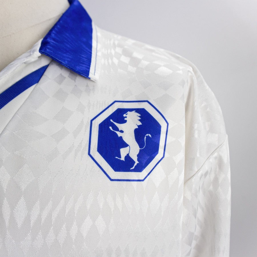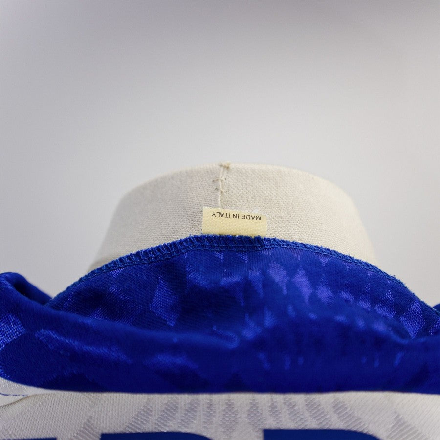 Maglia Away della Fidelis Andria della stagione 1997/1998 utilizzata nelle gare in trasferta della Fidelis nel campionato di Serie B. Di colore bianco con inserti blu, colletto a polo senza bottoni e maniche lunghe. Loghi Fidelis Andria, Biemme e BPM sublimatici fronte, lettering "SCARPONI" e numero 15 applicati sul retro. Patch Lega Calcio applicata sulla manica destra.