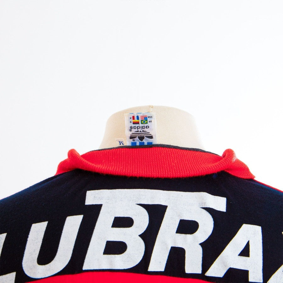 Flamengo short sleeve home jersey 1987/1988 season. Rossoneri uniform with v-neck without buttons. Flamengo logo painted on the heart side and Lubrax logo in the middle. The ADIDAS logo is flocked on the right side, while on the back we find the number 9 flocked and another Lubrax logo painted on the shoulders.