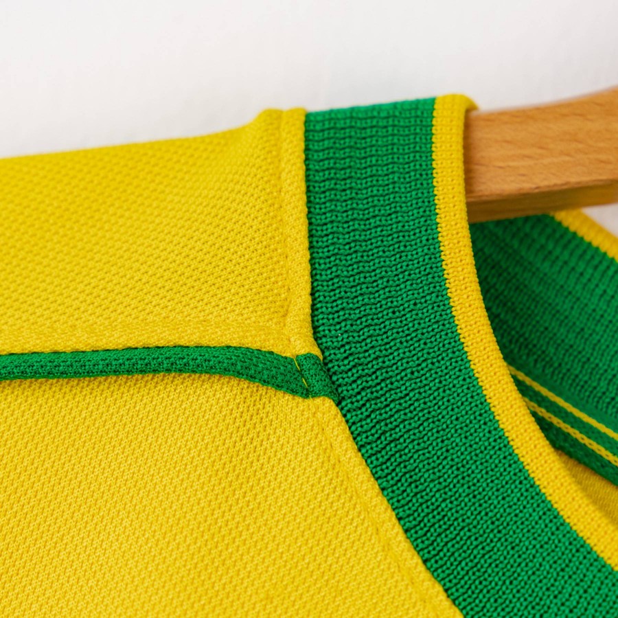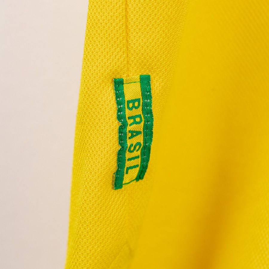 Brazil home version shirt for the 1998 World Cup played in France. Crew neck and half sleeve model. The national team patch on the heart side and the logo of the technical sponsor Nike on the right are embroidered on the front. The number 9 is printed in light plastic in the center. The lettering RONALDO and the number 9 are printed on the back.