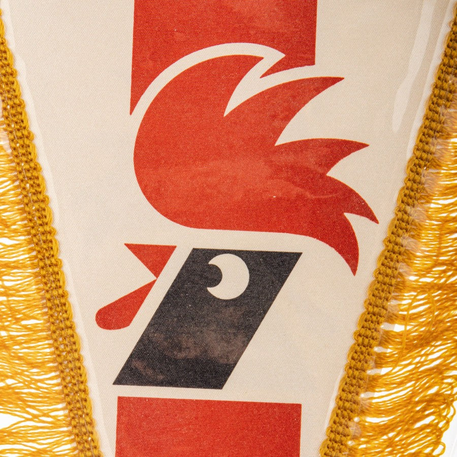 Official AS Bari pennant from the 1980s, an iconic memorabilia piece representing the history and identity of the Apulian club. This triangular pennant features the Bari crest on the front, with the famous red rooster on a white background, accompanied by the "A.S. Bari" lettering. The back showcases the Italian tricolor, emphasizing the club’s national pride. Finished with gold fringe and a hanging cord, it is a perfect collectible for fans and football memorabilia enthusiasts.