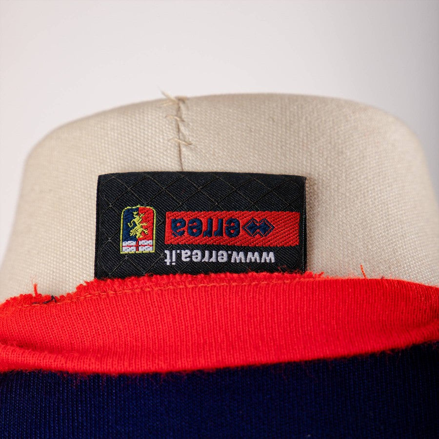 Genoa training sweatshirt. Model with crew neck and long sleeves. The sweatshirt is red and blue and on the front has sewn on the heart side the patch of Genoa, while in the middle is applied the logo of technical sponsor Errea. Ribbed crew neck and cuffs for a more attractive design.