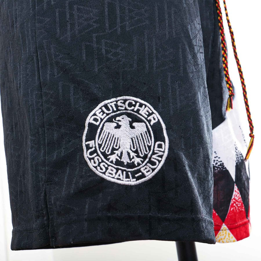 Shorts of the national soccer team of Germany of the World Cup USA 94. Black color with fantasies in the plot made with the colors of the German flag. Adidas logos and Germany Football Federation embroidered on the front. Closure with yellow, red and black laces.