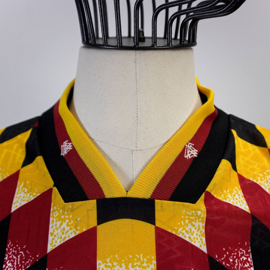 Germany vintage shirt, 1994, strong colors and defined pattern, excellent condition, embroidery patches in order, stiff collar. Adidas technical sponsor, missing label.