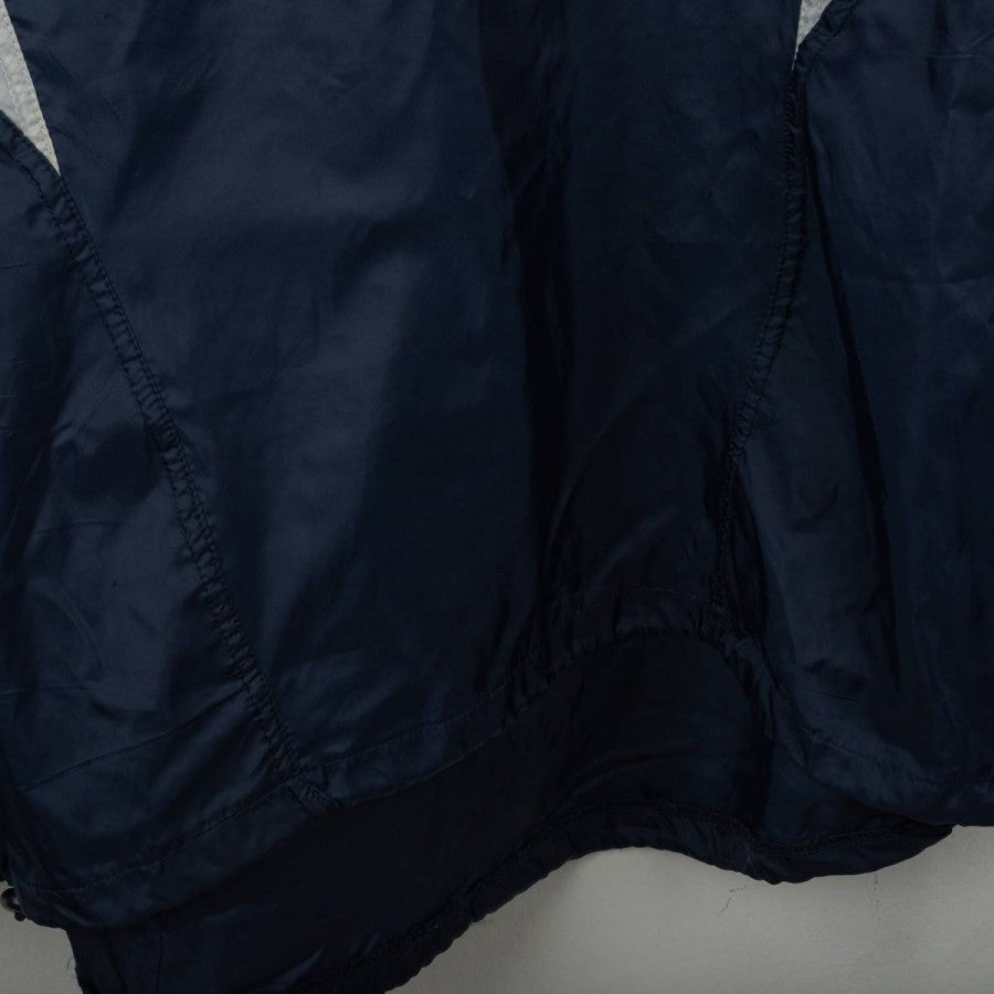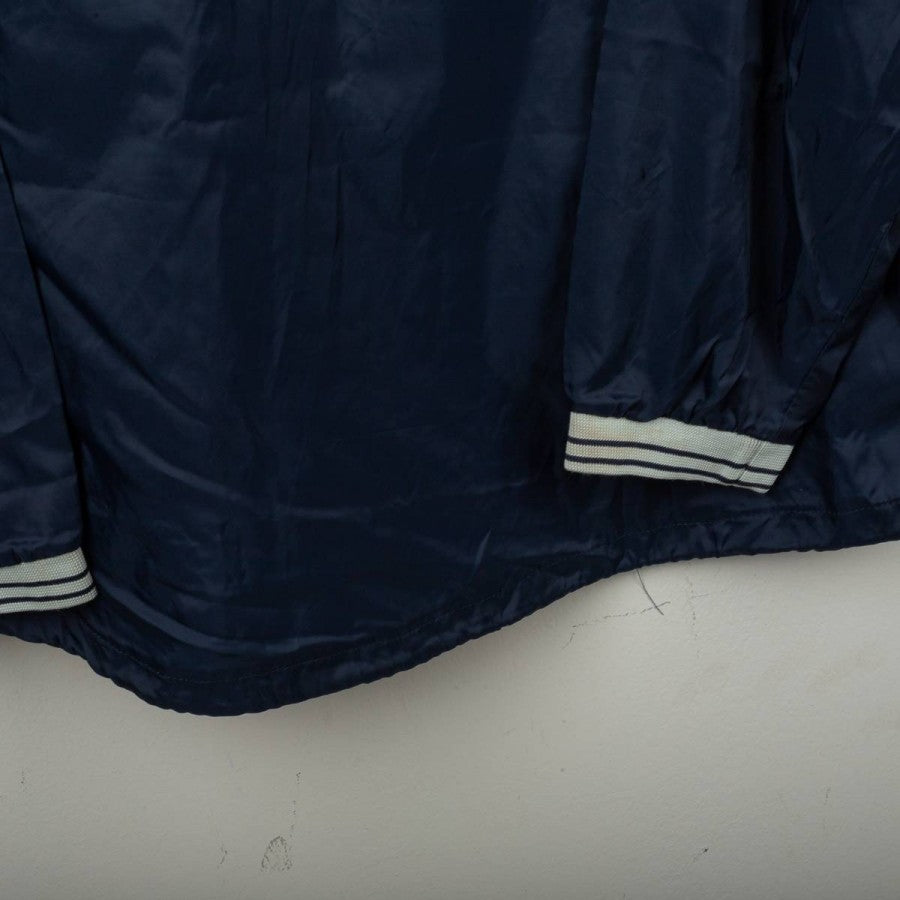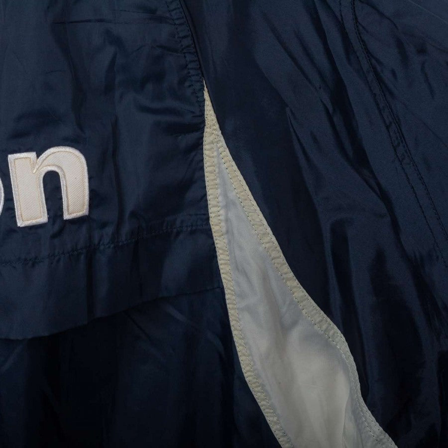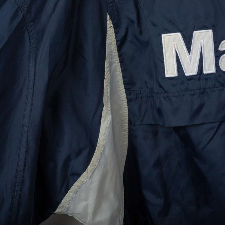 Bologna FC 1909 rain jacket from the 2001/2002 season, made by Macron. Navy blue with grey details on shoulders and ribbed collar with white and blue stripes. White embroidered Macron logo on the right chest, large “Bologna FC 1909” lettering applied in white on the front. Bologna FC crest stitched on the sleeves. Large white Macron logo with red circle on the back. Loose fit. Size XL. Official technical rain jacket, iconic from the early 2000s.