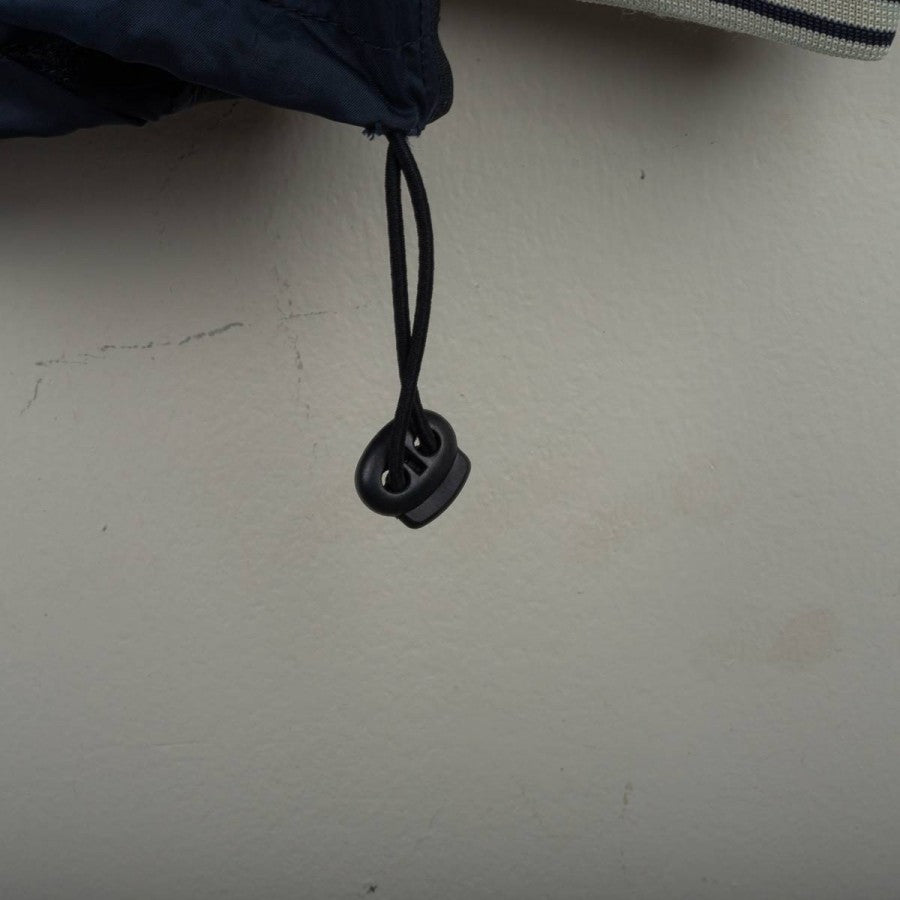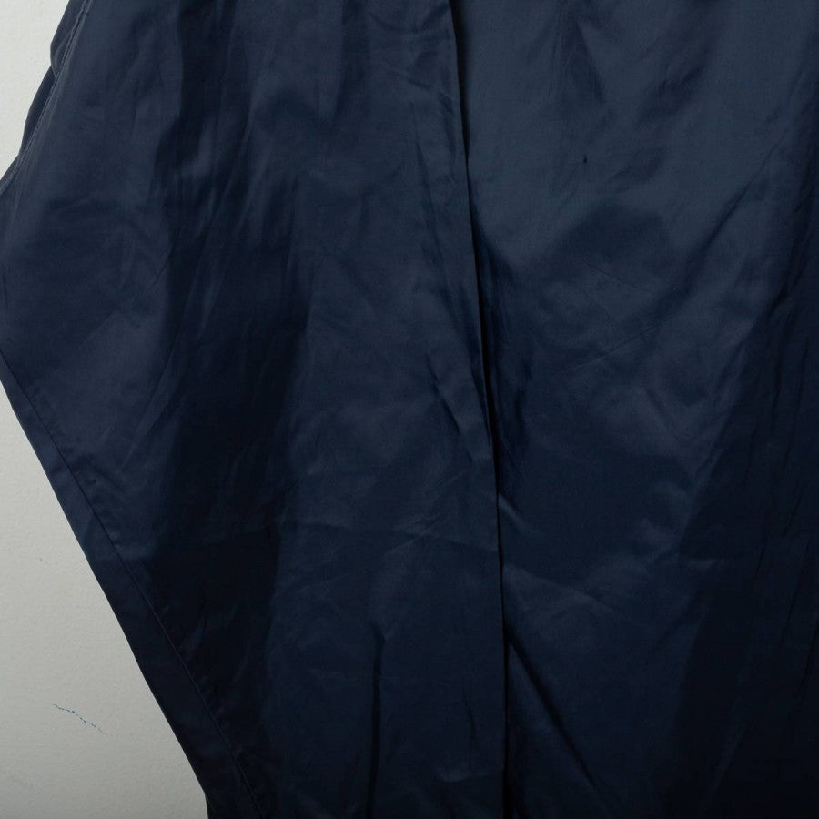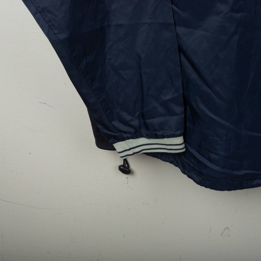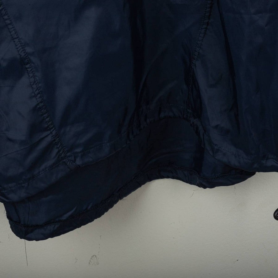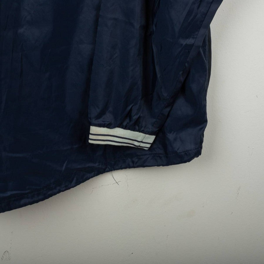 Bologna FC 1909 rain jacket from the 2001/2002 season, made by Macron. Navy blue with grey details on shoulders and ribbed collar with white and blue stripes. White embroidered Macron logo on the right chest, large “Bologna FC 1909” lettering applied in white on the front. Bologna FC crest stitched on the sleeves. Large white Macron logo with red circle on the back. Loose fit. Size XL. Official technical rain jacket, iconic from the early 2000s.