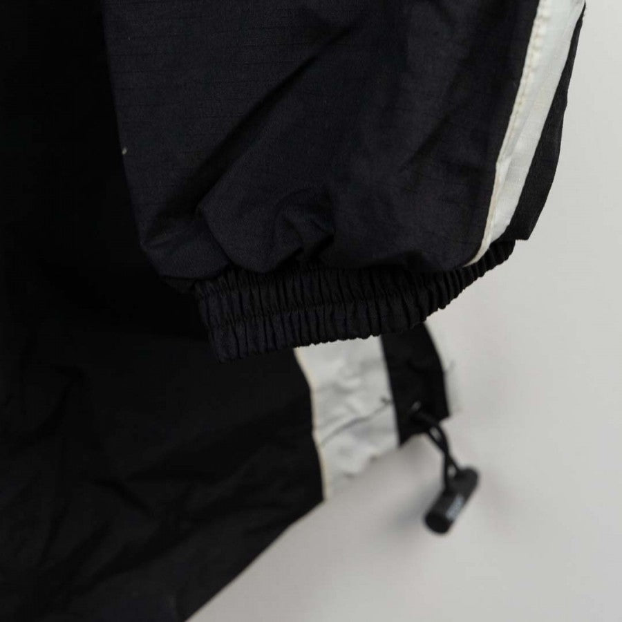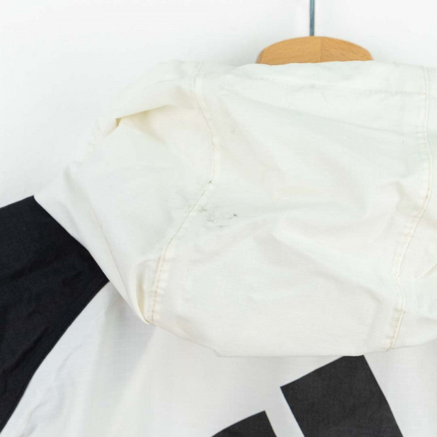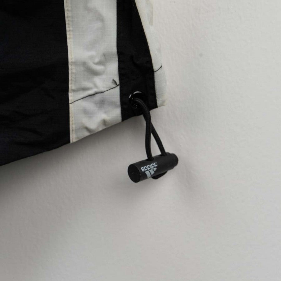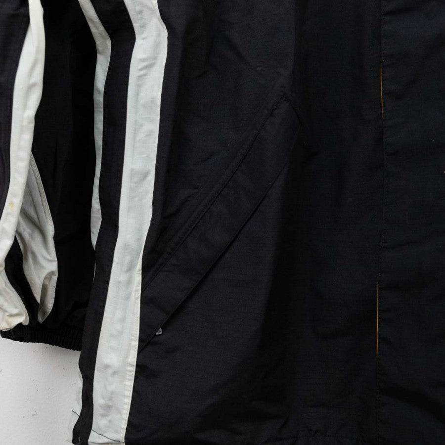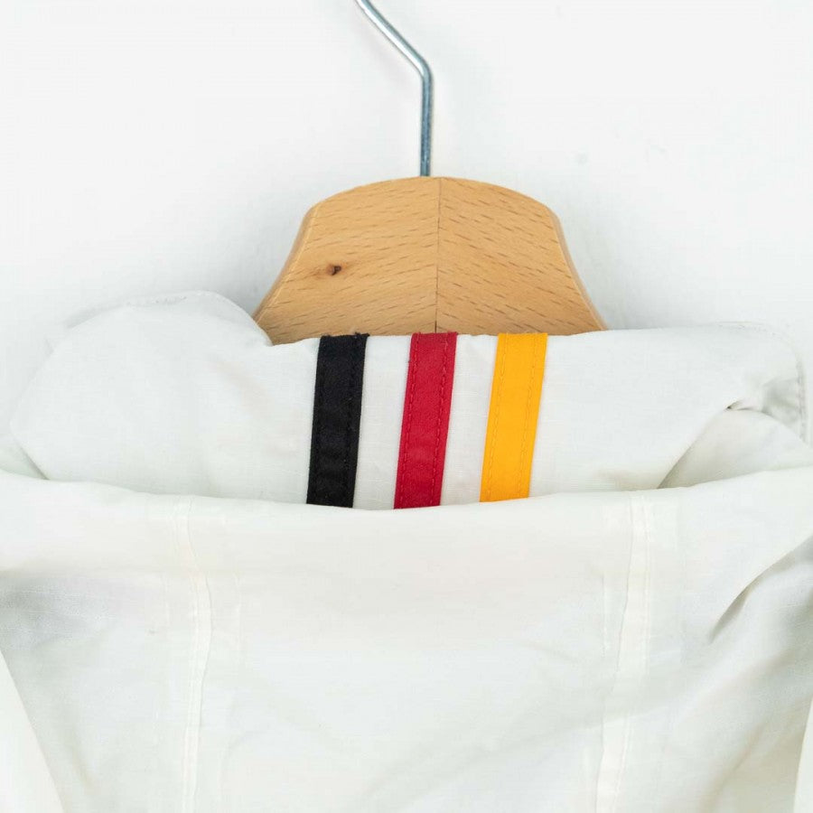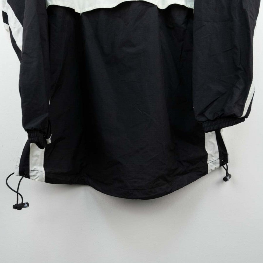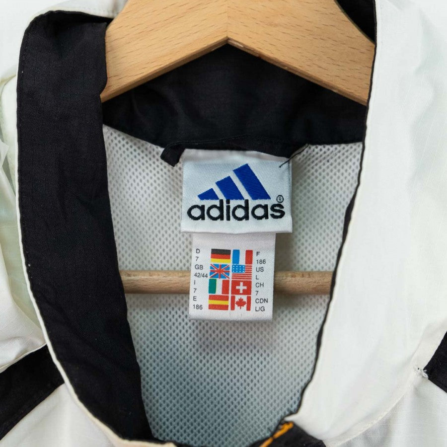 Official jacket of the German national team from the 1998 season, produced by technical sponsor Adidas. The design features a bold color block scheme: black on the lower body and sleeves, white on the shoulders and hood, with the iconic German tricolor stripes—black, red, and yellow—crossing the chest. Embroidered Adidas logo and DFB crest on the front. The back displays a large black Adidas logo. Equipped with a hood and adjustable drawcord hem. Size L (186), as stated on the label.
