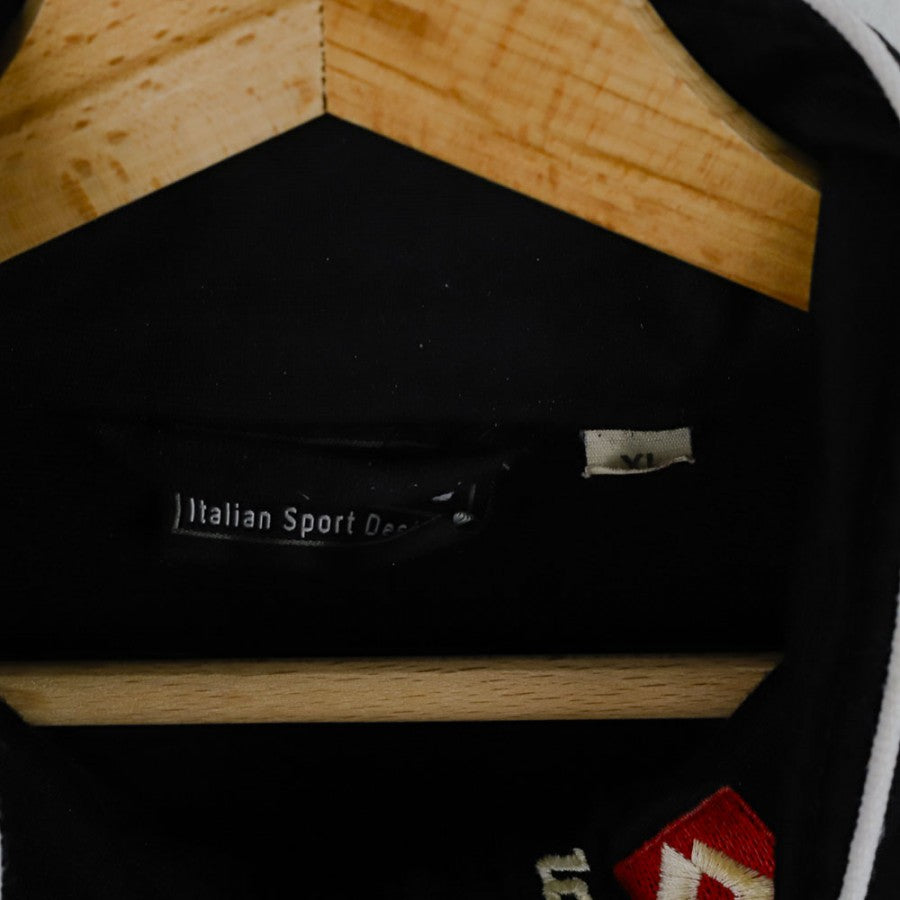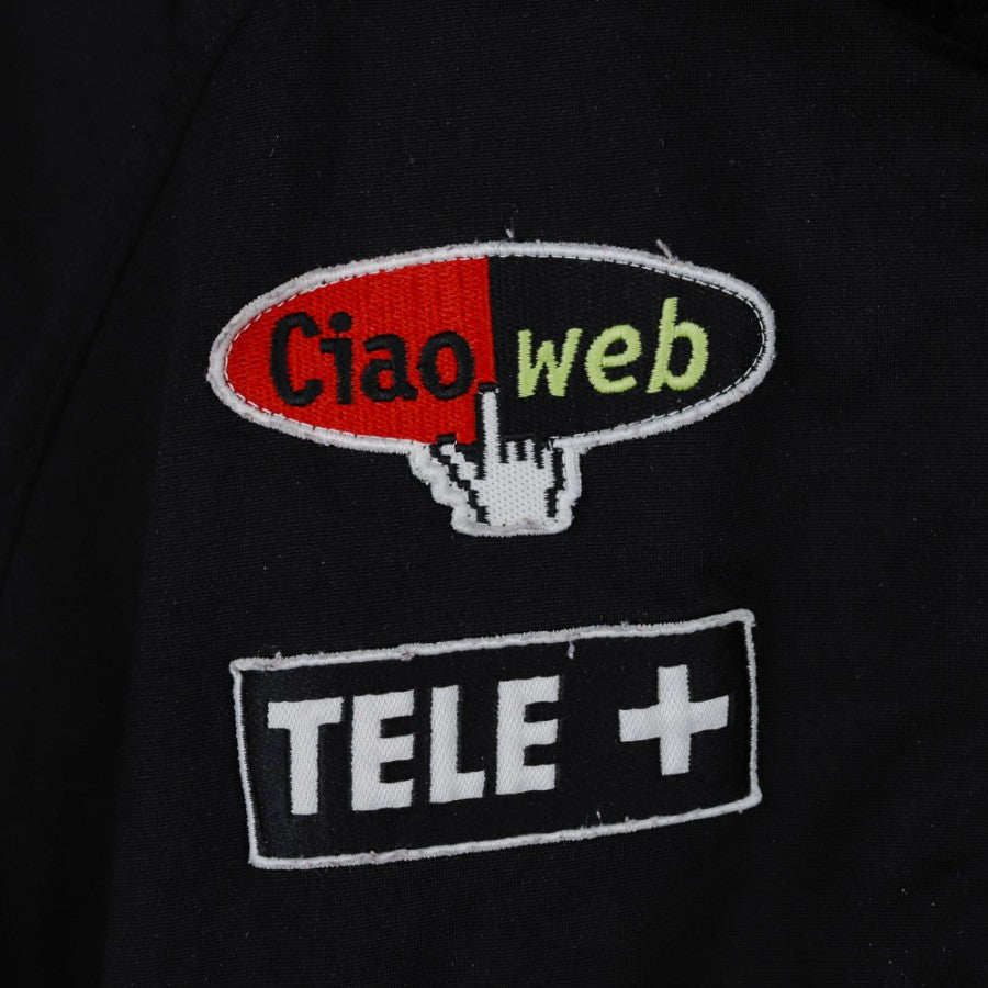 Official Juventus jacket from the 2000/2001 season, produced by technical sponsor Lotto. This XL jacket features a sleek black design with white details, stitched logos, and prominent sponsor patches. On the front, it showcases the Lotto logo, the Juventus crest with two stars, and the CiaoWeb and Tele+ branding. The sleeves include light gray inserts and a green patch with a distinctive graphic detail. Made with high-quality materials, this jacket offers both comfort and style, making it perfect for fans and collectors.