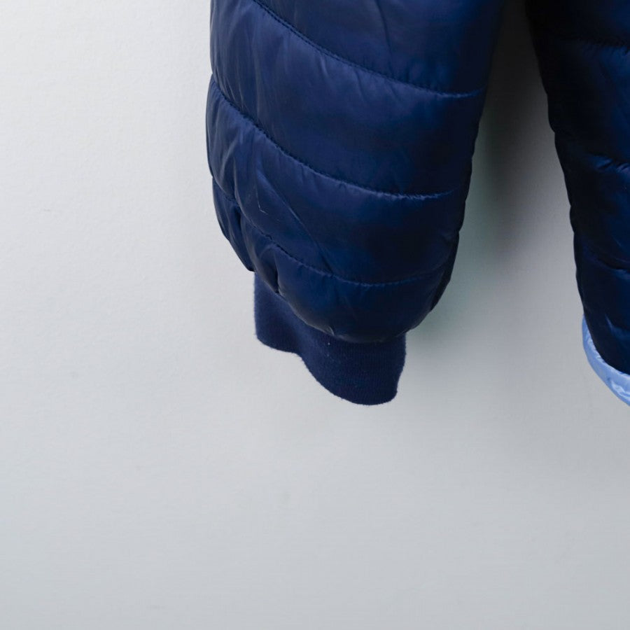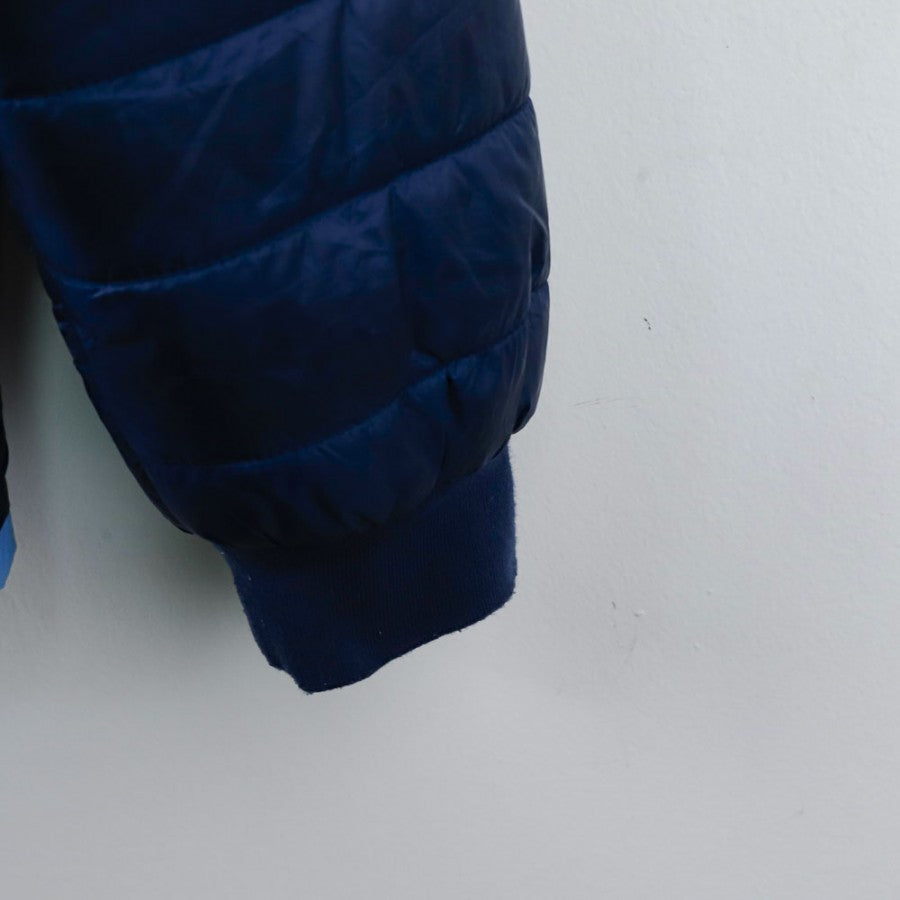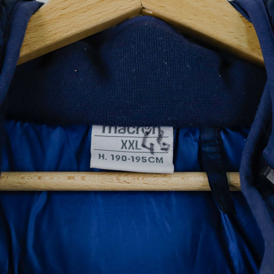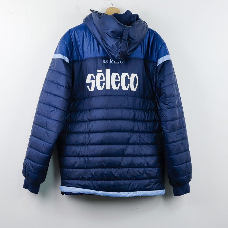 Official jacket of SS Lazio from the 2017/2018 season, produced by technical sponsor Macron. This padded navy-blue jacket features a functional and modern design, perfect for cold days. The front displays the embroidered Macron logo, Lazio crest with the stylized eagle, and the Seleco sponsor logo. The back showcases the "SS Lazio" name and Seleco branding. Equipped with an adjustable hood and elasticated cuffs, this jacket is a must-have for Lazio fans. Size XXL.