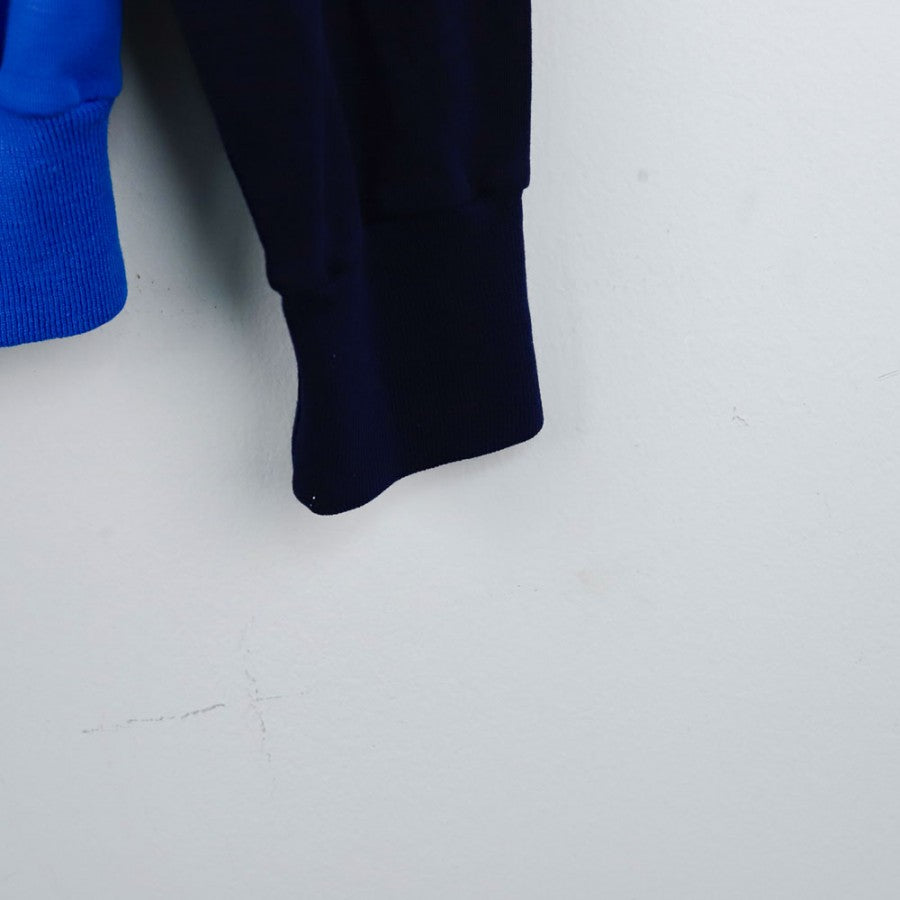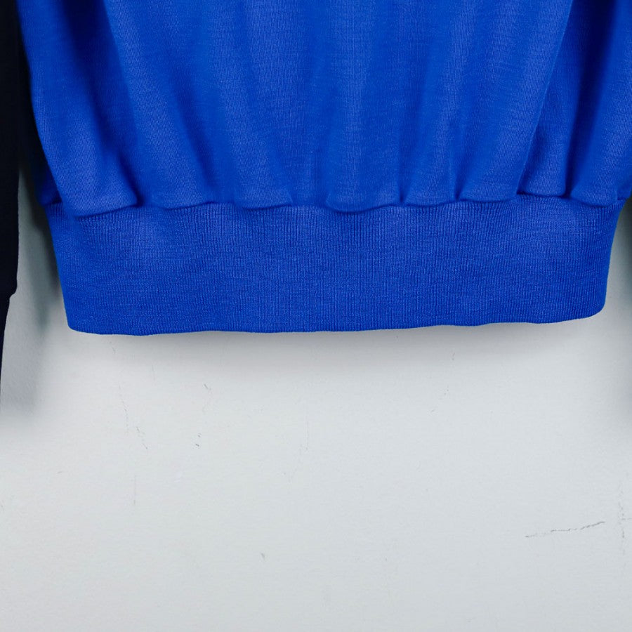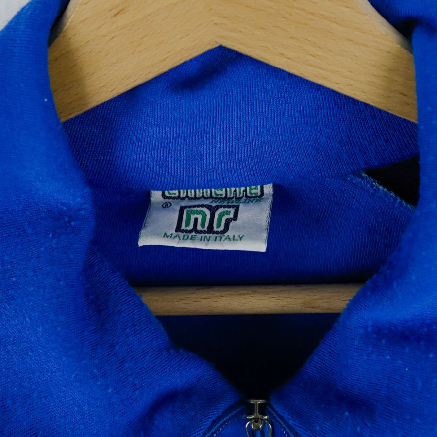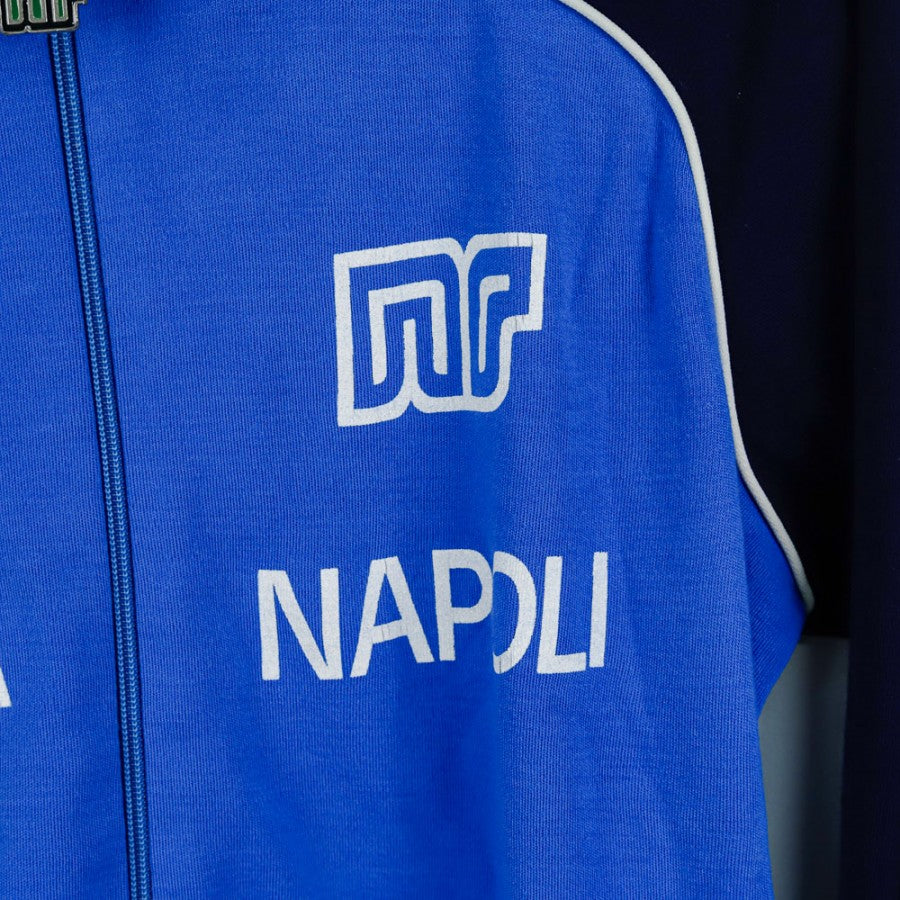 Official Napoli jacket from the 1983/1984 season, made by technical sponsor Ennerre and featuring the classic design of the era. The jacket has a dominant azure color with dark blue sleeves and white details on the shoulders. The chest displays the Ennerre logo, the club’s name, and the commercial sponsor Latte Berna, which is also prominently featured on the back. With a zip closure and high collar, it is a historic piece for Napoli fans.