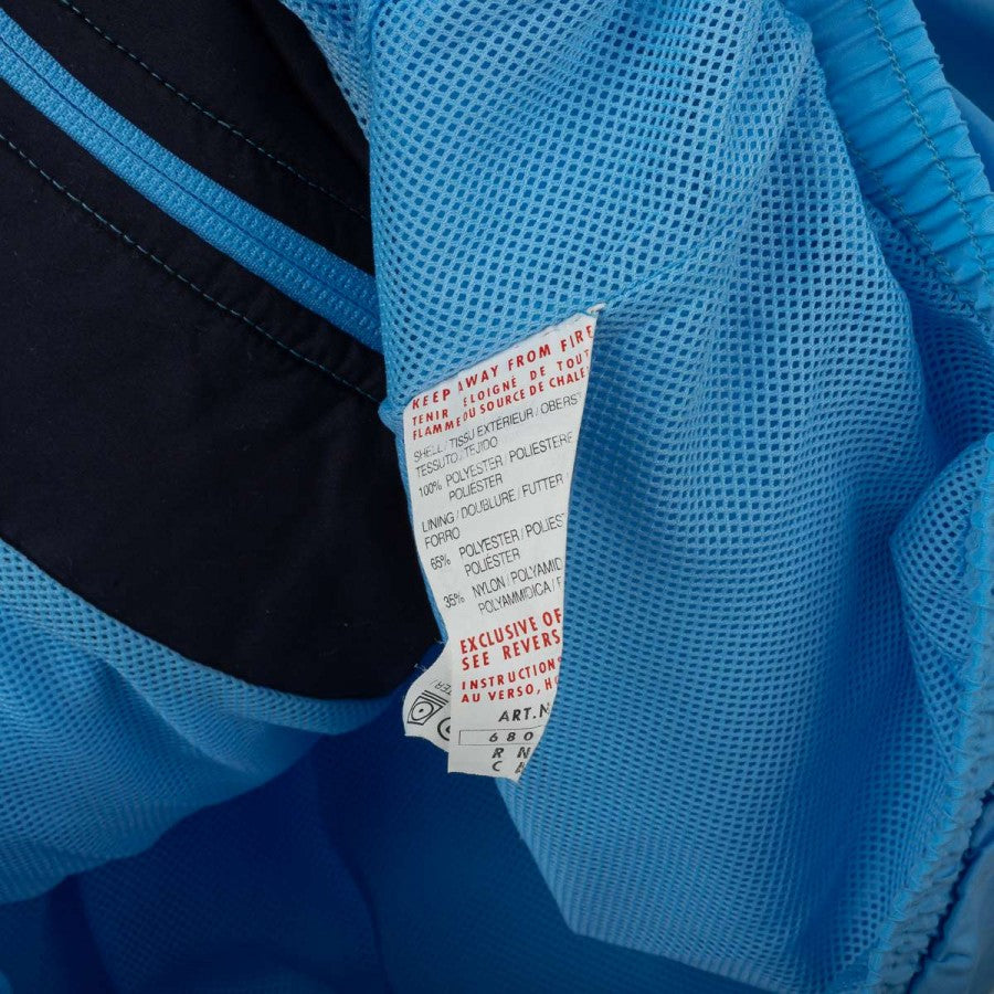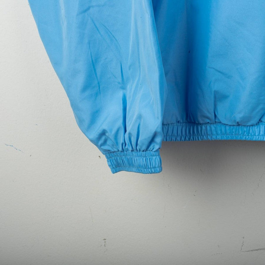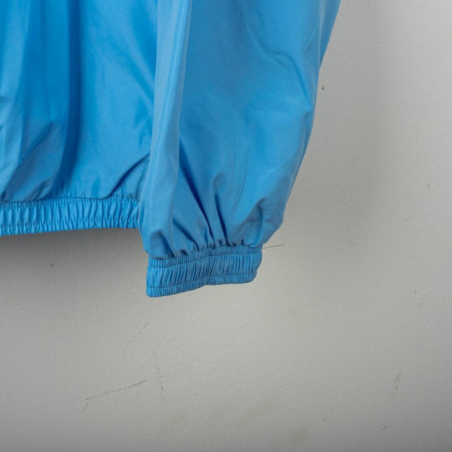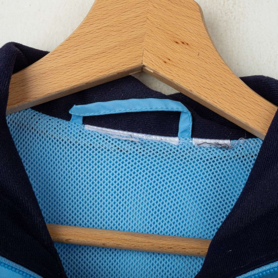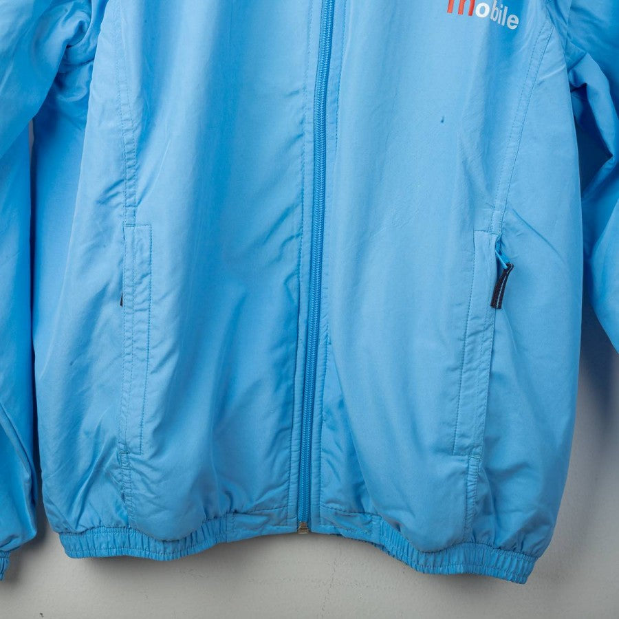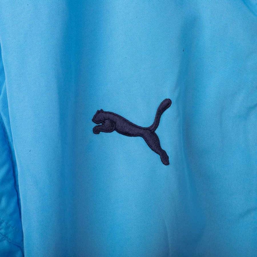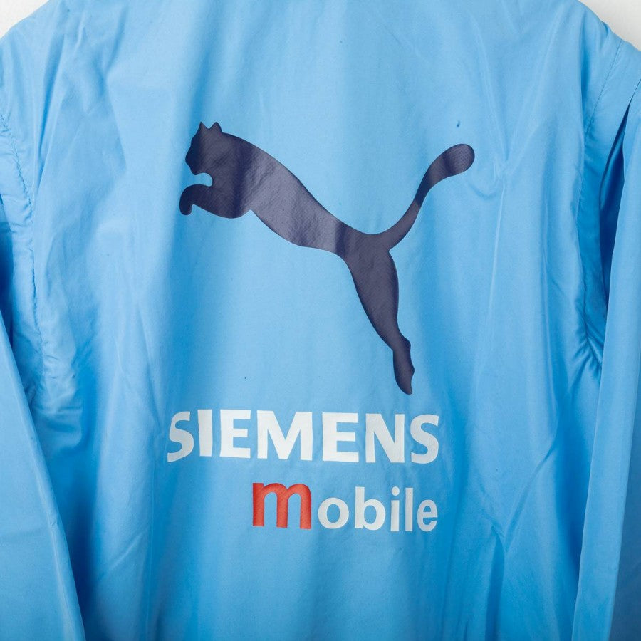 Lazio presentation jacket from the 2000/2001 season, made by Puma. Light blue shell with navy collar detail, black Puma logos on chest and back, and stitched Lazio crest on the left chest. Siemens Mobile sponsor printed front and back. Full zip closure and zip side pockets. Mesh lining for breathability. Regular fit. Size L.