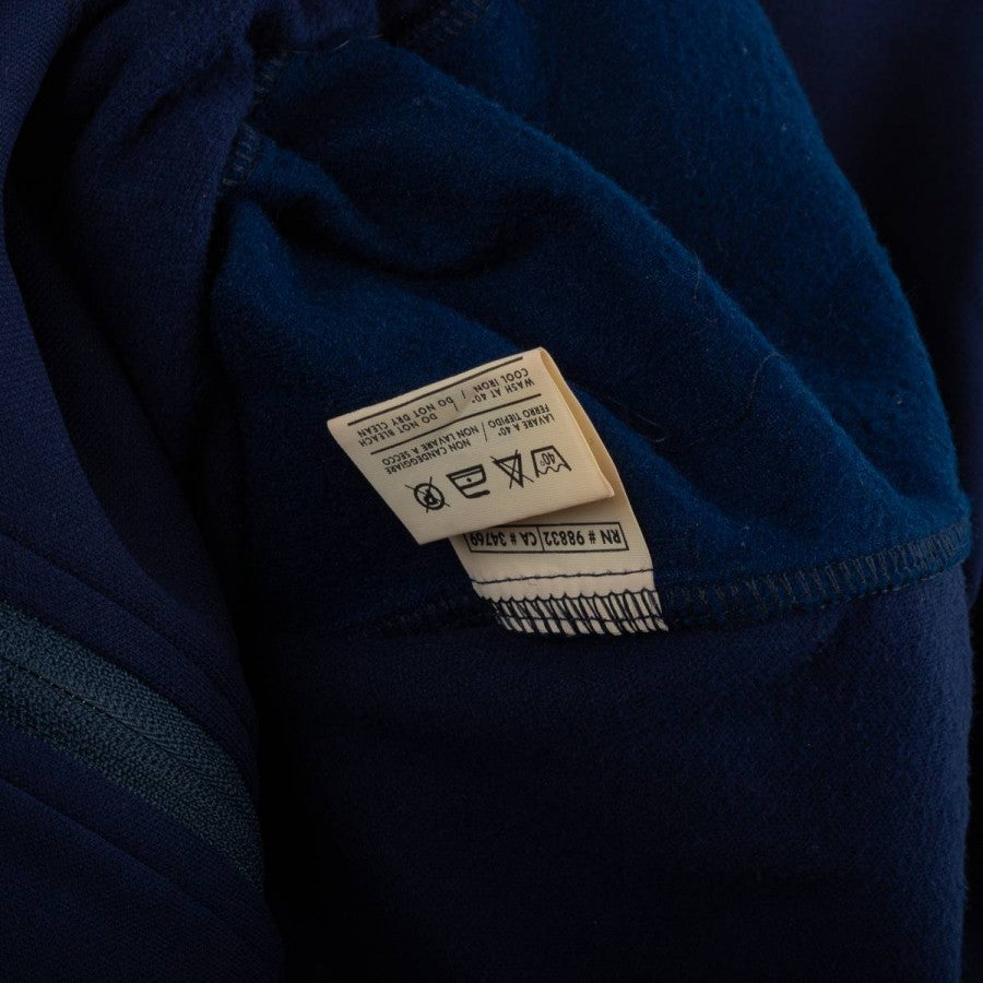 AS Roma training jacket from the 2000/2001 season, made by Kappa. Navy blue with dark blue inserts on the sleeves and red details on the collar. Orange embroidered Kappa logo on the right chest and both sleeves, embroidered AS Roma crest on the left chest. “as roma” text and INA Assitalia sponsor embroidered in white and orange on the back. Full front zip closure. Regular fit. Size L. Original vintage jacket from Roma’s Scudetto-winning season.