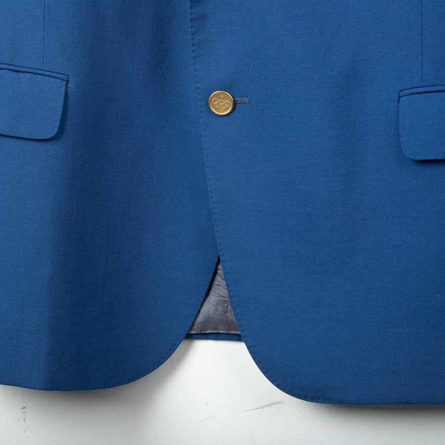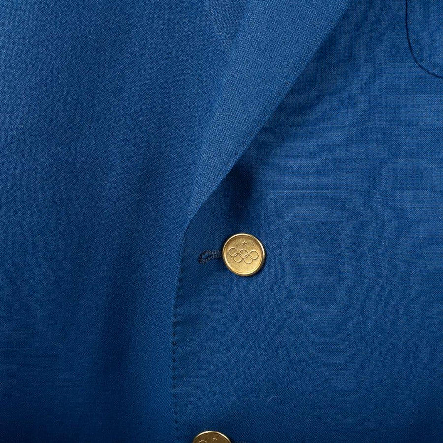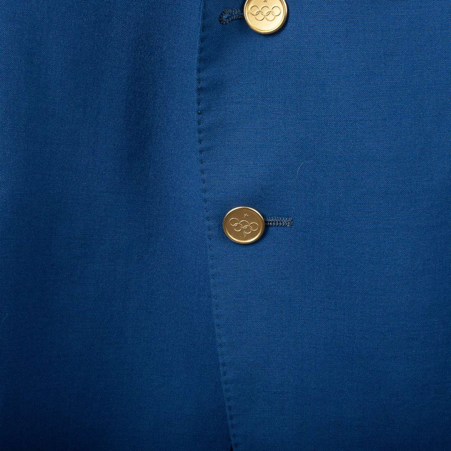 Official tailored blazer of the Italian Olympic team, crafted by iconic fashion house Valentino. Finished in a bold blue shade with red piping on the collar, it proudly displays the CONI crest with the Olympic rings and Italian tricolor on the chest. A unique item symbolizing Italian sartorial excellence and national sporting pride.