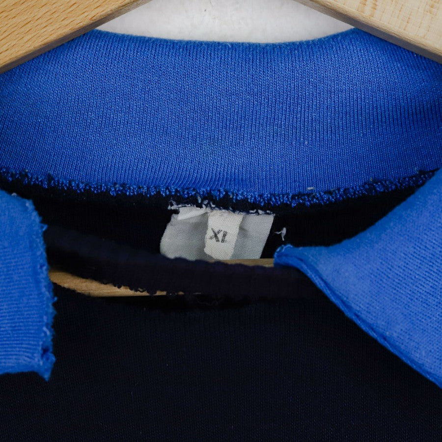Official Napoli tracksuit jacket from the 1991/1992 season, produced by technical sponsor Umbro. This iconic item features the traditional colors of light blue and navy, with the Umbro logo embroidered on the chest and "S.S.C. Napoli" lettering completing the design. The commercial sponsor Voiello is prominently displayed on the front and back, adding a distinctive touch. Featuring a polo collar and elasticated cuffs and hem, this jacket in size XL is a rare and sought-after piece for football enthusiasts.