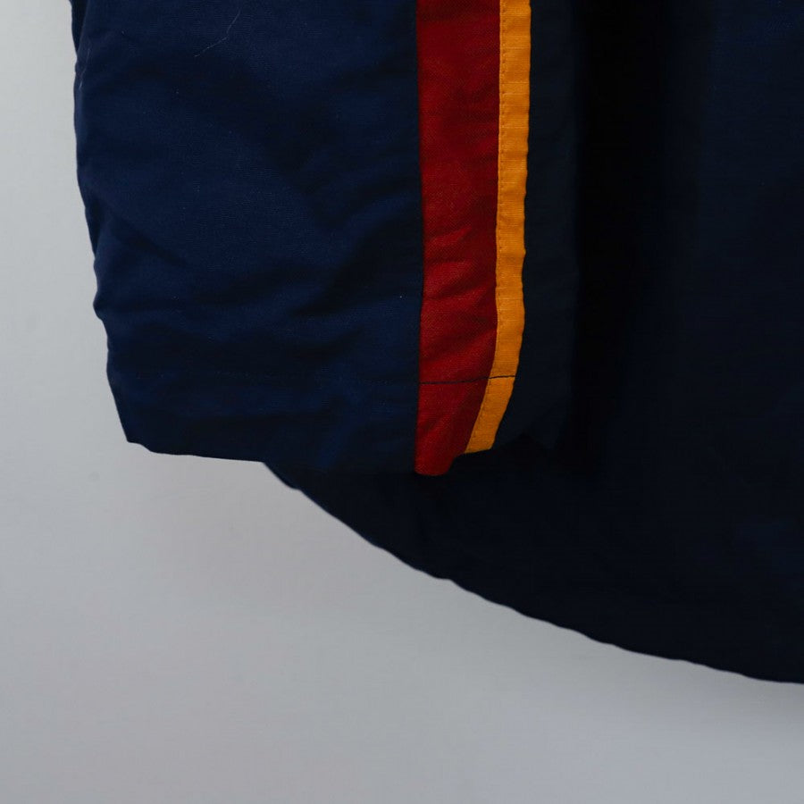 Official AS Roma winter jacket from the 2003/2004 season, produced by technical sponsor Diadora. This XL-sized jacket features a dark blue design with yellow-red details along the sleeves and collar. The chest displays the embroidered Diadora logo and AS Roma crest, alongside the "as roma" text, while the Mazda commercial sponsor logo is printed on the back. Equipped with a hood, a zippered front closure, and buttons, this jacket is perfect for colder days.