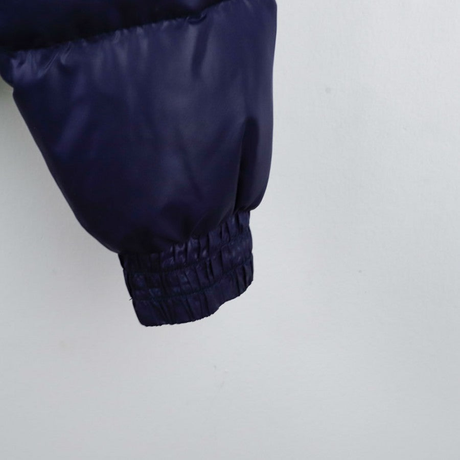 Official Parma jacket from the 2012/2013 season, produced by technical sponsor Errea. In navy blue, this padded jacket features embroidered logos of the sponsors "Navigare" and "Vorwerk Folletto" on the chest, along with the Parma FC crest on the heart side. The back features the Errea logo and the "Parma F.C." lettering in yellow embroidery. The jacket has a full-zip closure and side pockets with snap buttons. Size S.