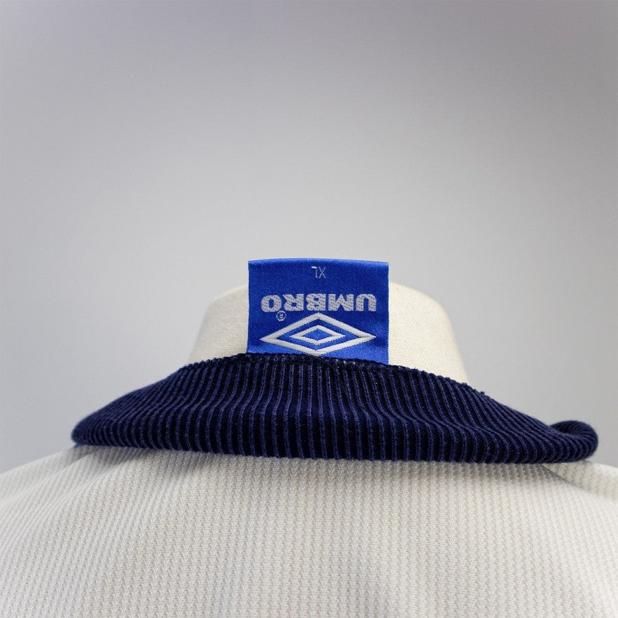 England shirt, 1996, vivid white color, perfect conditions except for a slight stain on the lower front, proper embroidery, stiff collar, Umbrian technical sponsor.
