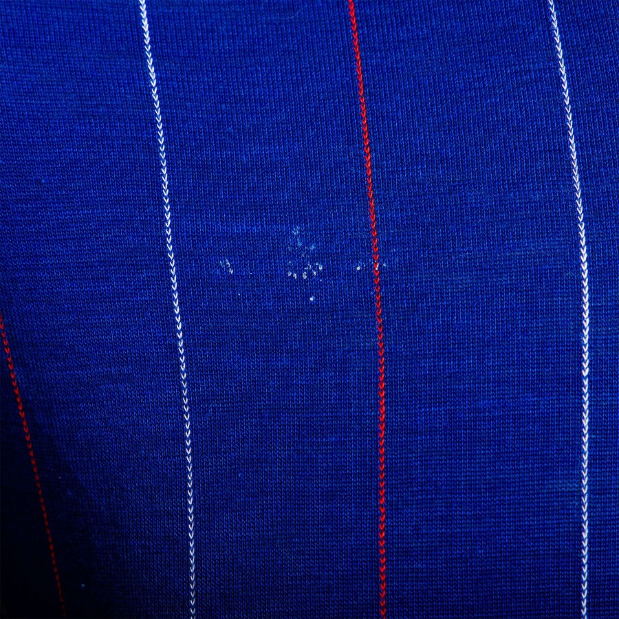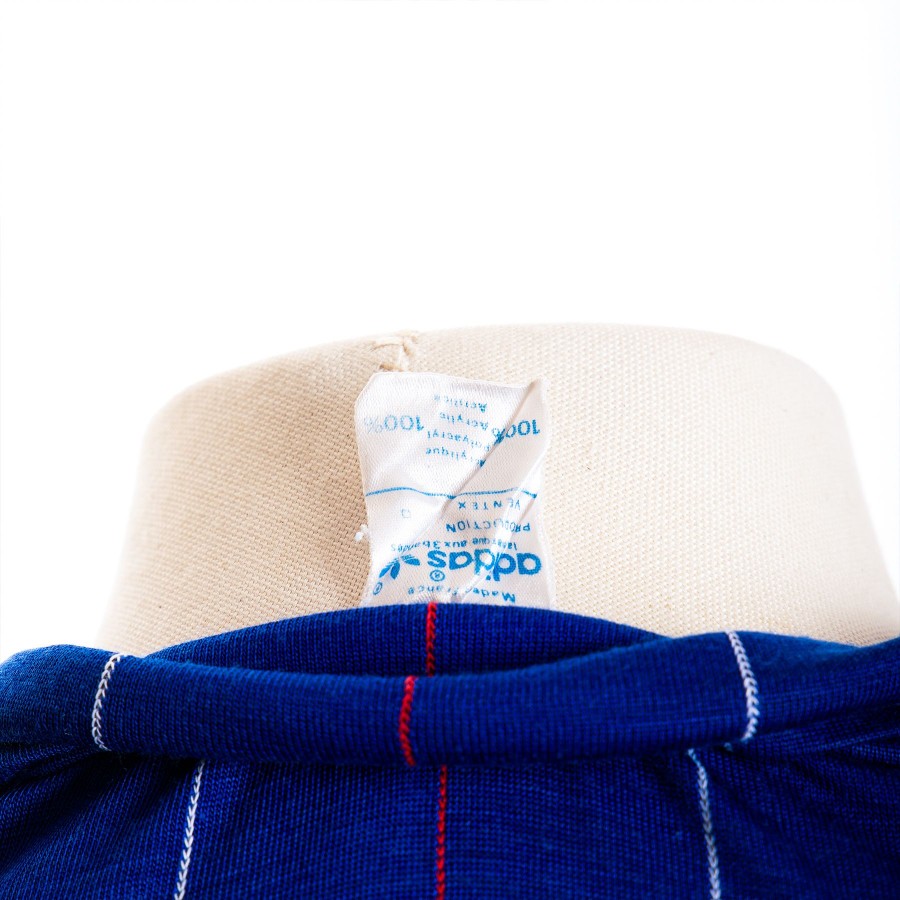 Home Jersey of France period 82-83 long sleeves blue color with red and white inserts. Buttonless polo neck, French Federation logo flocked on the heart side and ADIDAS logo painted, but now gone, on the right side.