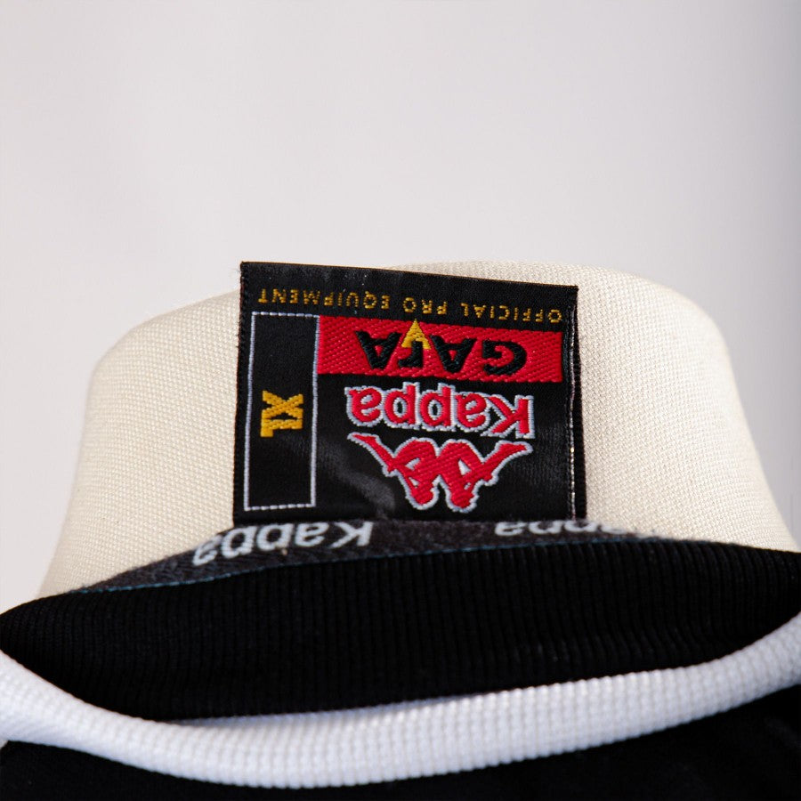 Juventus home shirt from the 1999/2000 season customized with Daniel Fonseca's name and number 11. Kappa logo embroidered in black with white piping. Juventus logo sewn on the left side. CanalSatellite sponsor printed on the front. The Lega Calcio patch is present on the sleeve.