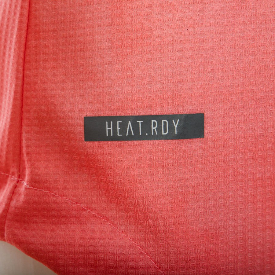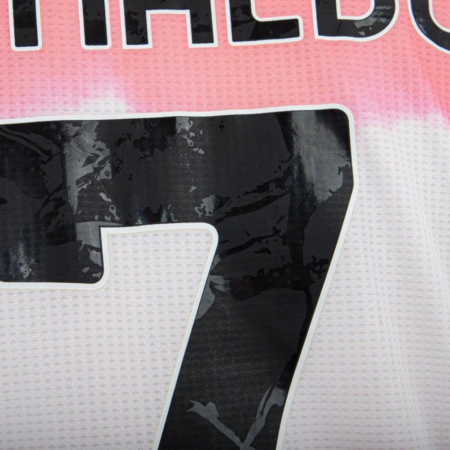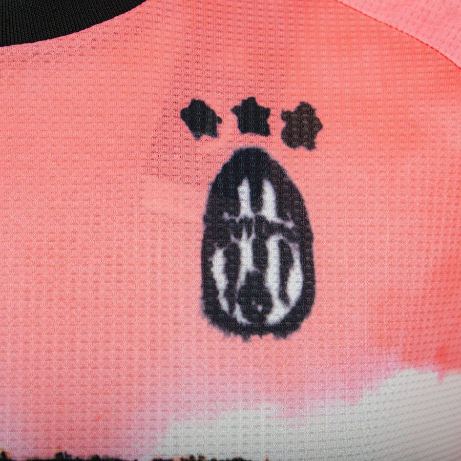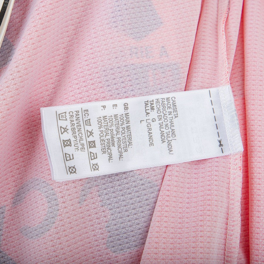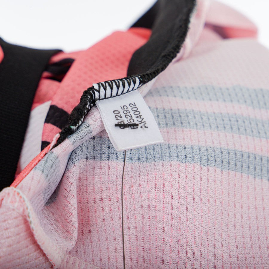 The product is clearly visible from a large number of photos. The shirt is short-sleeved, predominantly light pink in color; the center of the article and the sleeves are marked by horizontal stripes in a more accentuated pink colour; made with a 'melting' effect, we find on the left the club logo, in the older version, on the opposite side the black logo of Adidas, technical sponsor, and in the center the Jeep patch, commercial sponsor of the bianconeri.