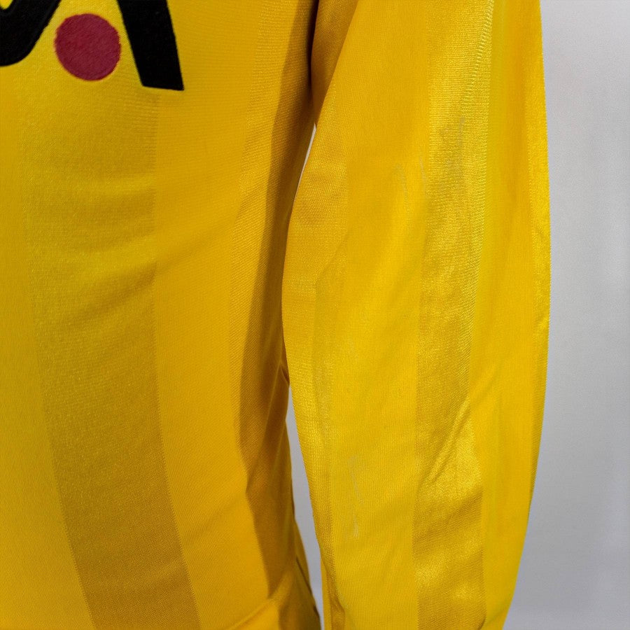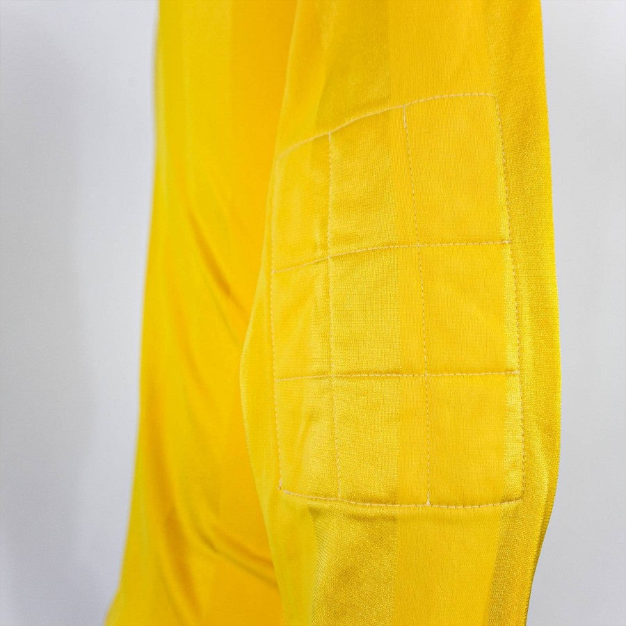 The shirt is in good condition from the point of view of the fabric. The glossy yellow color has not suffered damage from time and is as bright as it used to be. The collar is slightly aged presenting a cotton fabric that suffers more the passage of time.