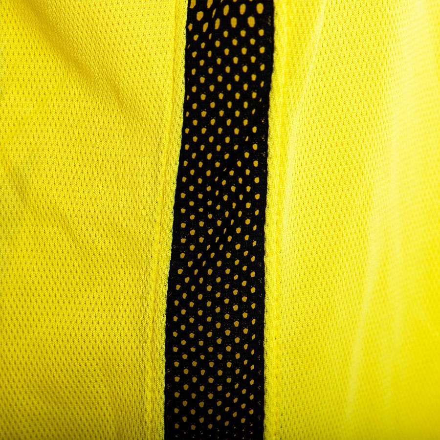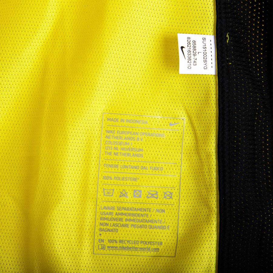 Mauro Icardi match shirt Third of Inter season 2015/2016. On the front is sewn the team logo on the heart side and is embroidered Nike logo on the right side. On the back are printed lettering ICARDI and number 9 in black plastic with yellow inserts. On the right sleeve is the Serie A Tim patch. The logo of the commercial sponsor is printed in light plastic. On the bottom there is the Nike Authentic sticker and inside is heat-sealed the manufacturer's label. On the sides, the fabric is slightly perforated, a typical detail of the uniforms prepared/worn.