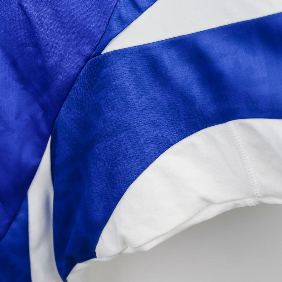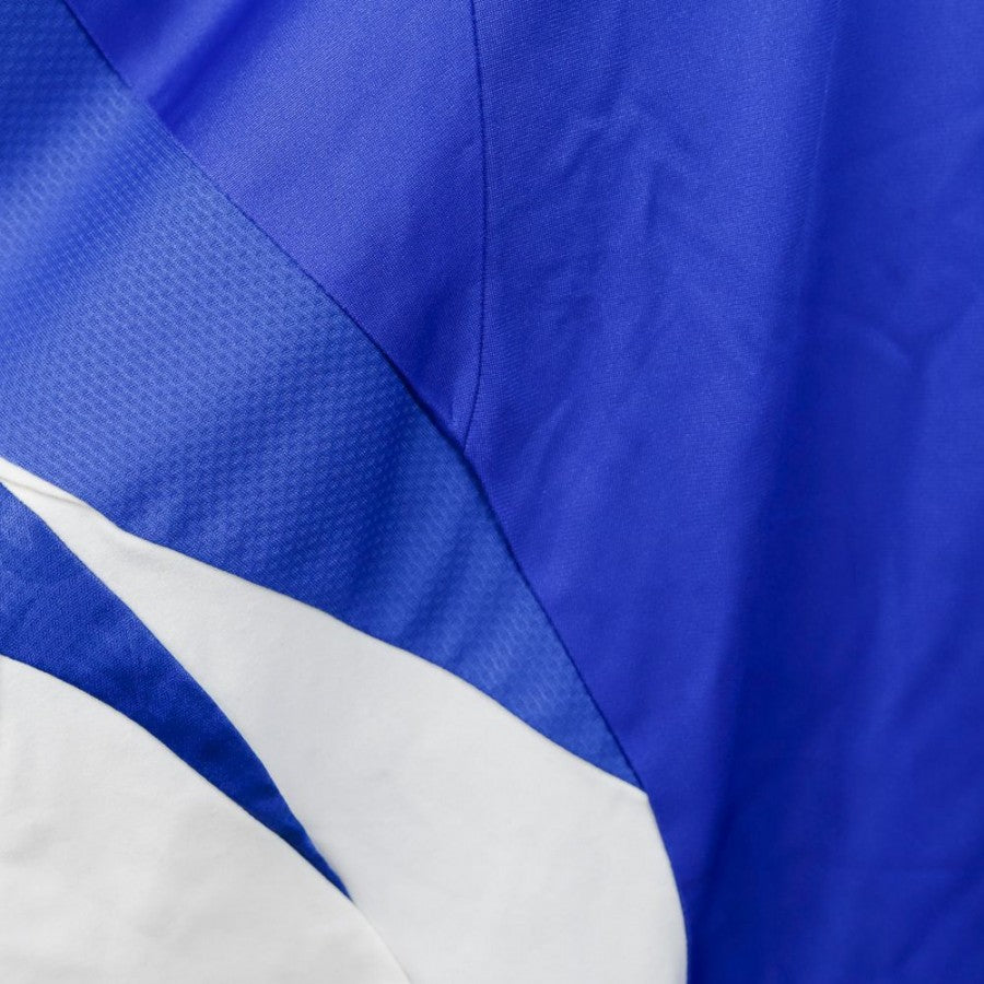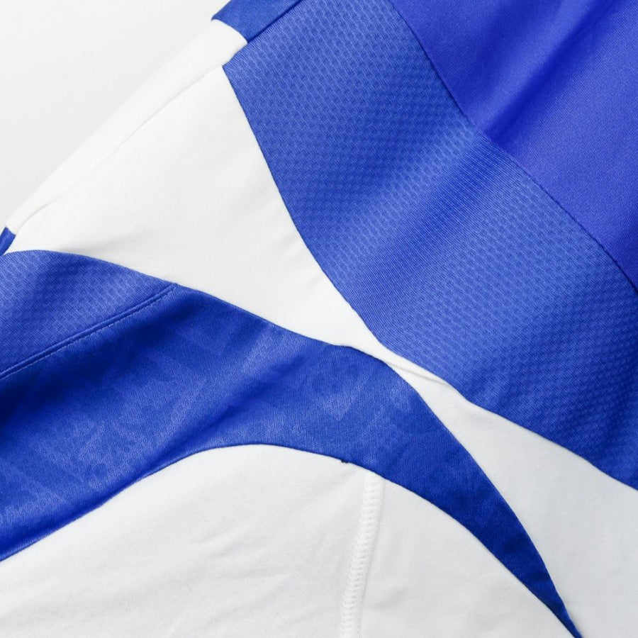 Built from a classic 1990s Diadora shirt in deep blue with white inserts, Pipitone retains the sacred symbols – the tricolour badge, the stars, the bold cuffs – but disrupts its structure through volume, asymmetry, and layered details. The oversized sleeves, stitched panels, and layered patches turn the kit into a wearable narrative.