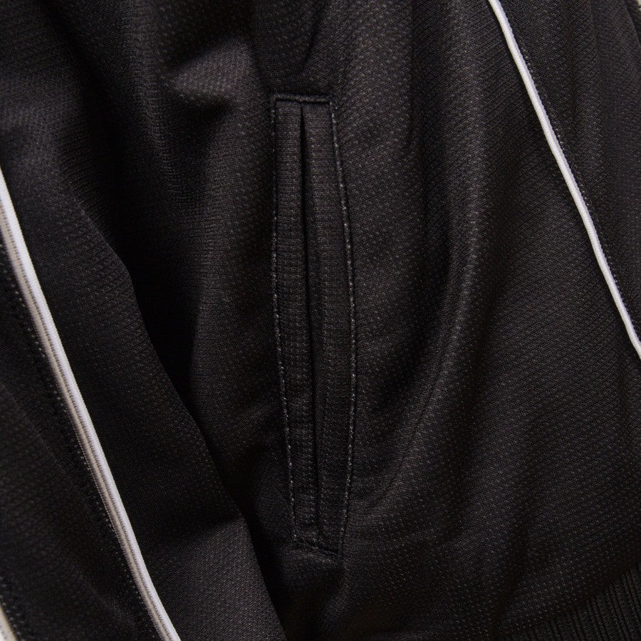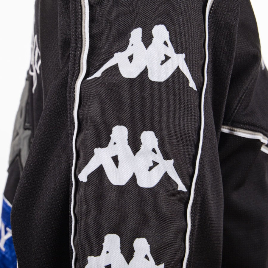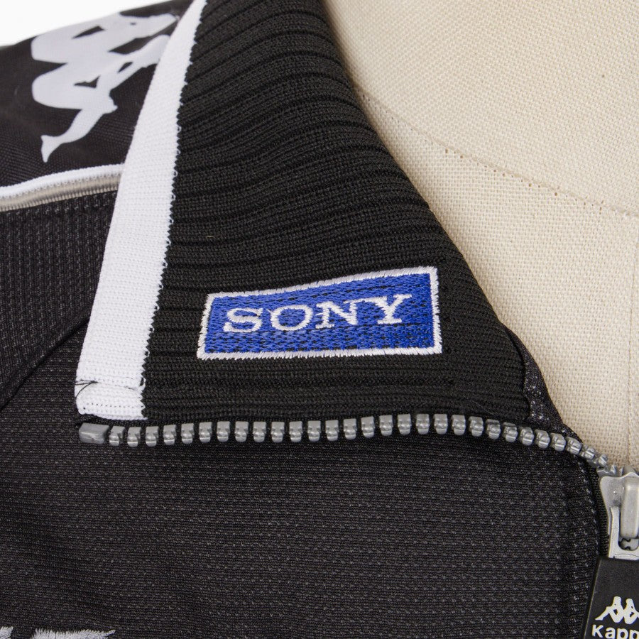 Black walk out suit model. What makes this garment magnificent are the rich details and sinuous inserts. Starting from the jersey collar with white piping, we find the logos of the sponsors Kappa and Sony embroidered on the inside. The suit is equipped with a full zip that stops its movement at the bottom. Along the shoulders, up to mid-sleeve we find a band of repeated Omini Kappa. On the front, the heart side, the Juventus club crest and the tricolor shield are embroidered, while the Kappa and Sony logos are always embroidered on the other side. On the back, the Juventus lettering applied surmounts the applied logos, here larger, of the commercial sponsor Sonny and the technical one Kappa.