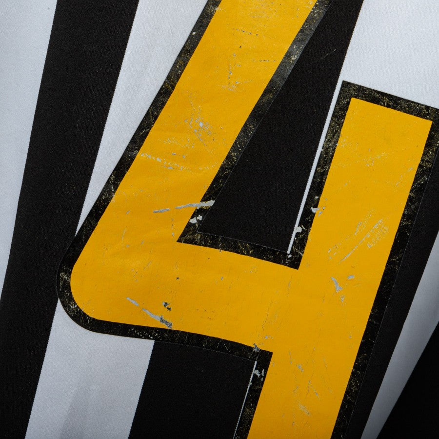 Short sleeve home model with classic black and white pattern with vertical stripes and crew neck. Cub patch in embroidery with the two stars on the heart side and Nike mustache on the right. Tricolor badge stitched in the center. MONTERO lettering and the number 4 are printed on the back. The Football League patch is applied on the right sleeve. Commercial sponsor Fastweb.
