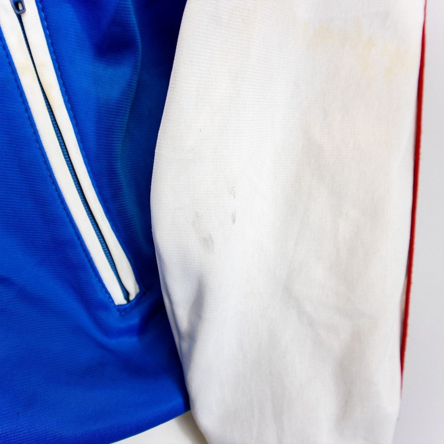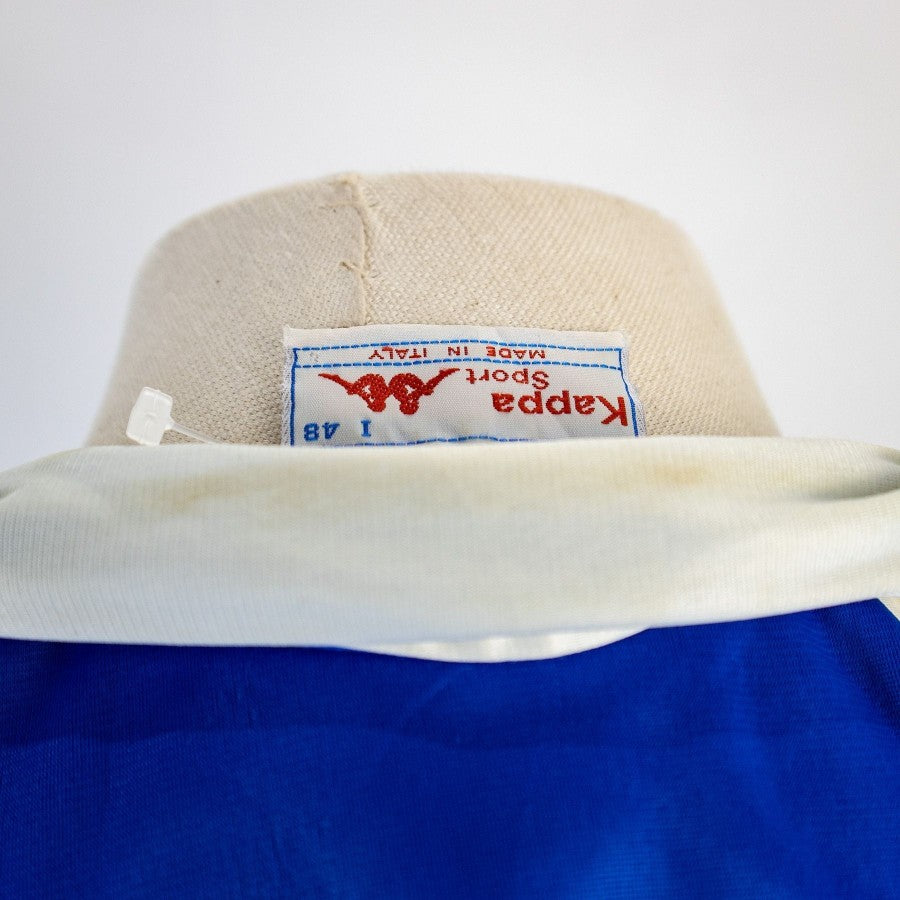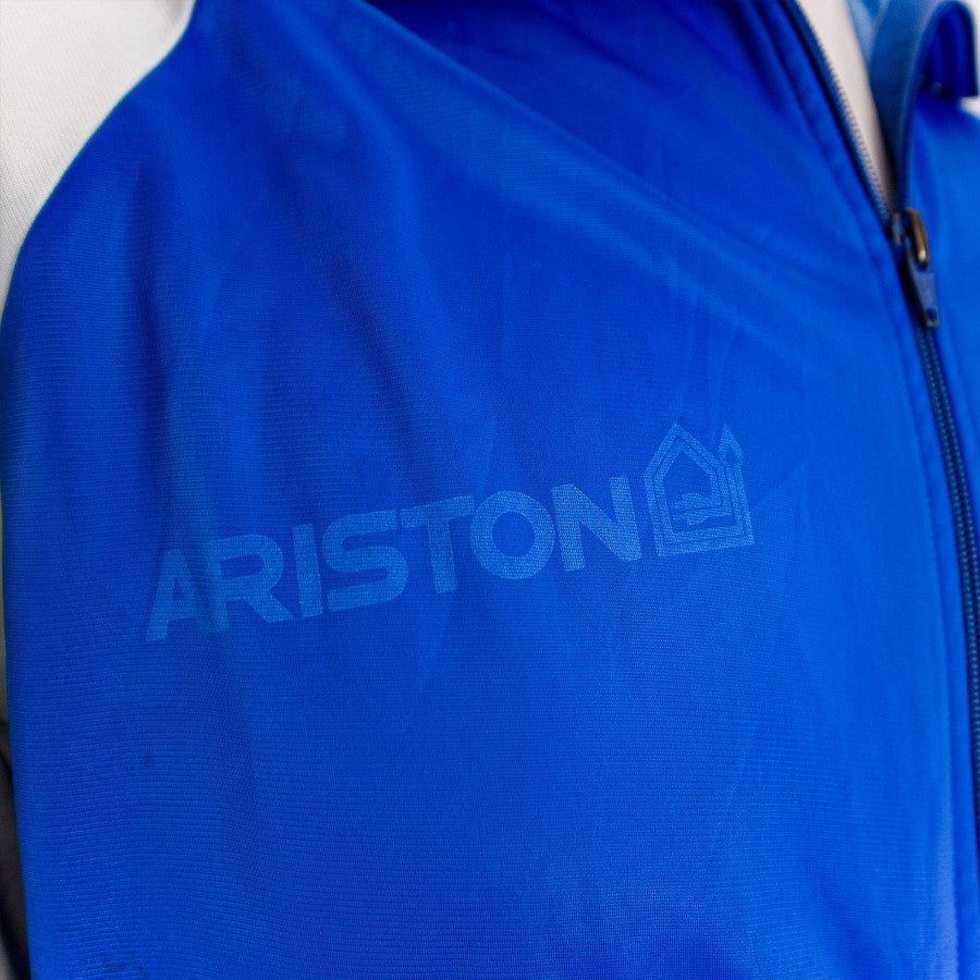 The “historic” Juventus suit as it was present in the supply for five consecutive seasons. Blue and white jacket, with the Ariston writing painted on the front.