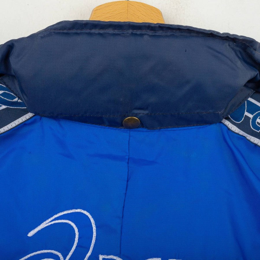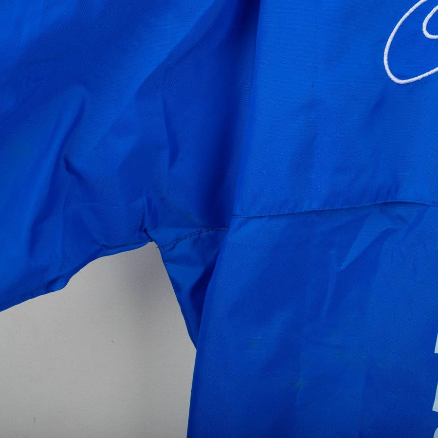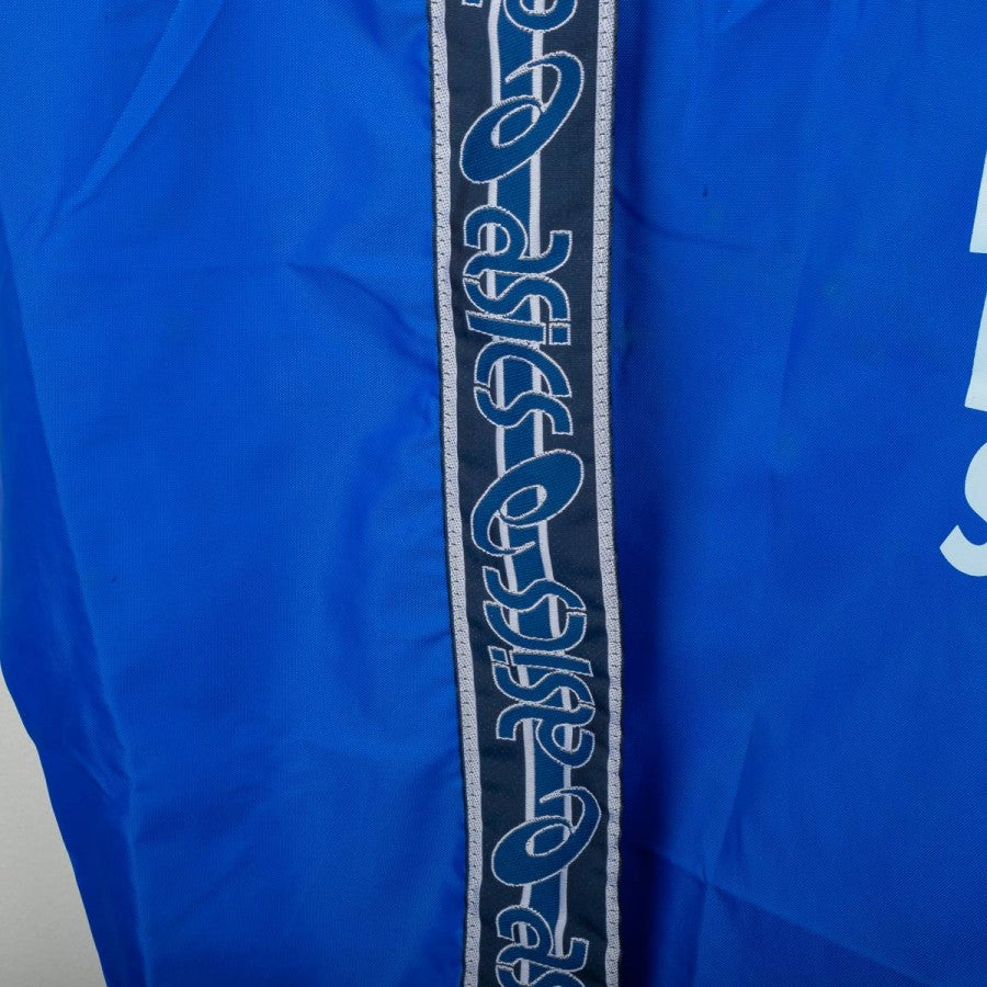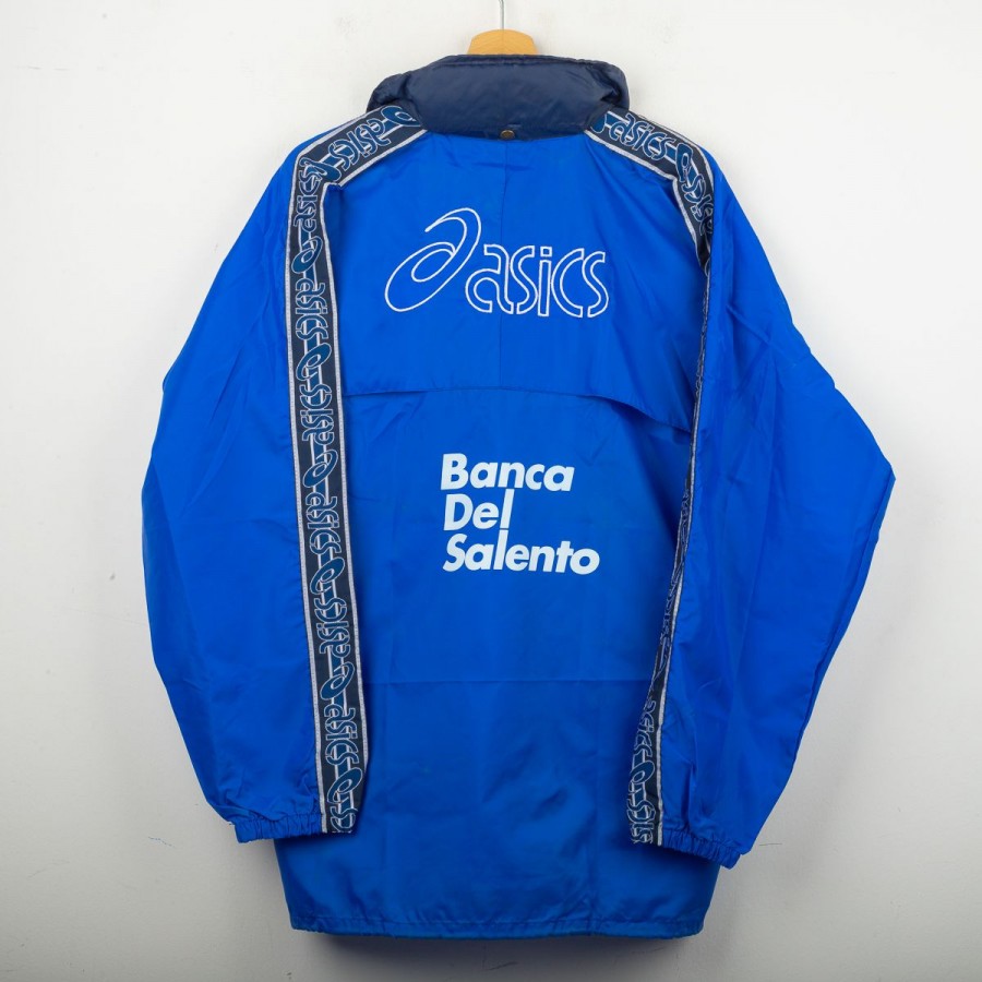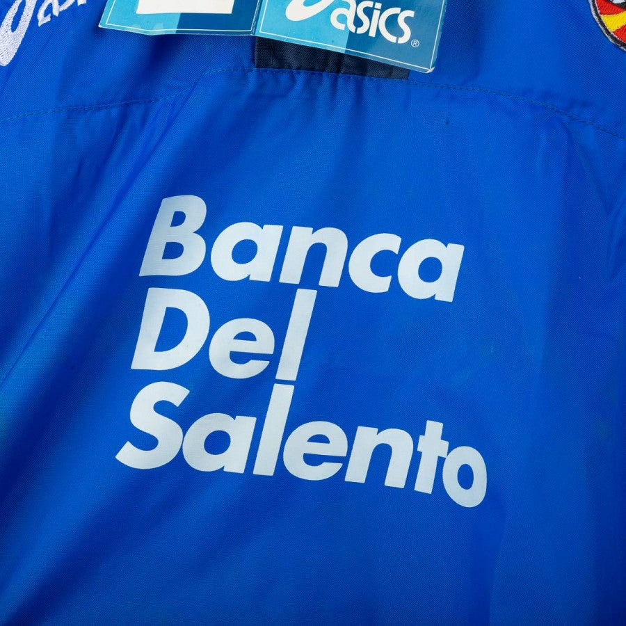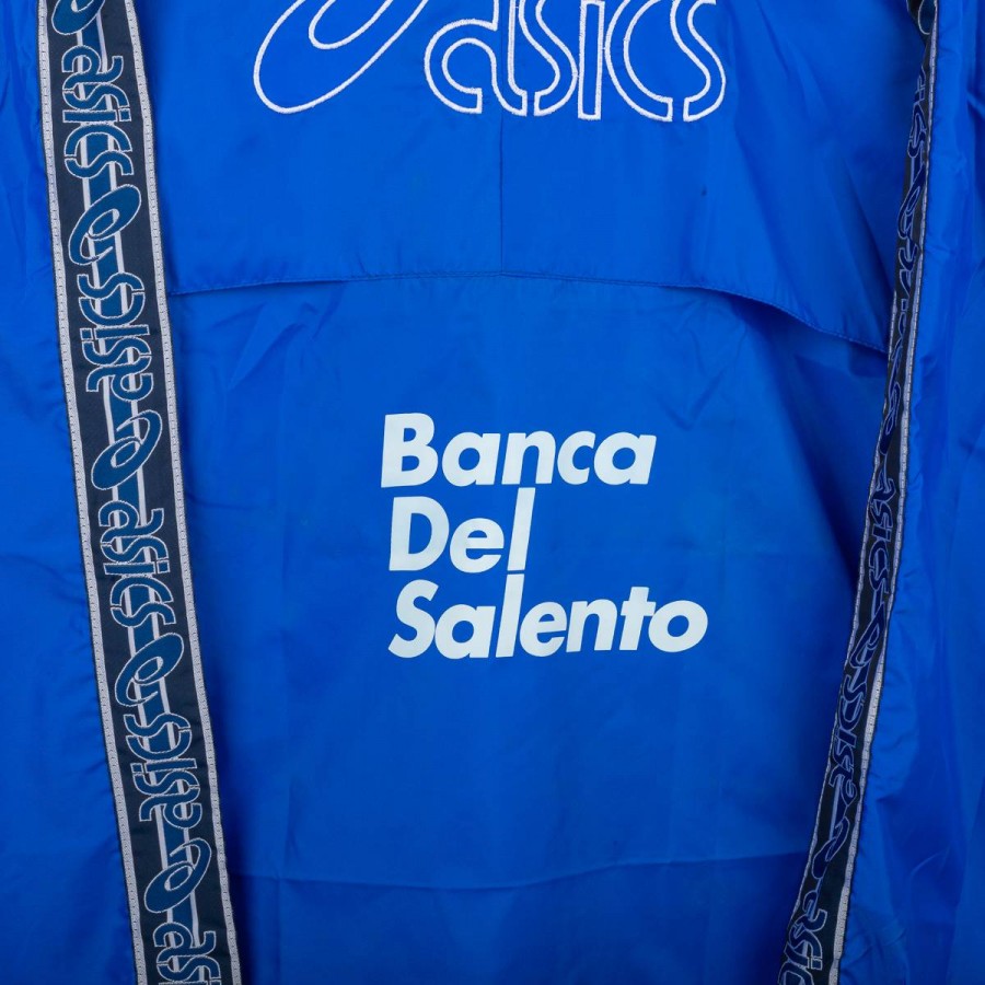 Official U.S. Lecce K-Way from the 1997/1998 season, made by Asics. Blue with white details and Asics logo tape along the sleeves. Embroidered white Asics logo on the right chest and on the back. Stitched Lecce crest on the left chest. “Banca Del Salento” sponsor printed in white on the front and back. High collar with snap buttons and half-zip front. Side pockets and adjustable hem. Original Asics label and tag still attached. Authentic vintage item from the 1997/1998 season.