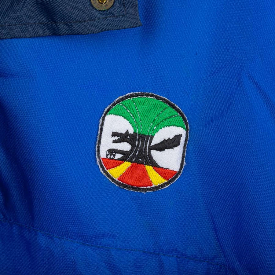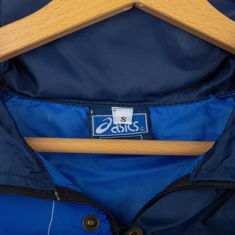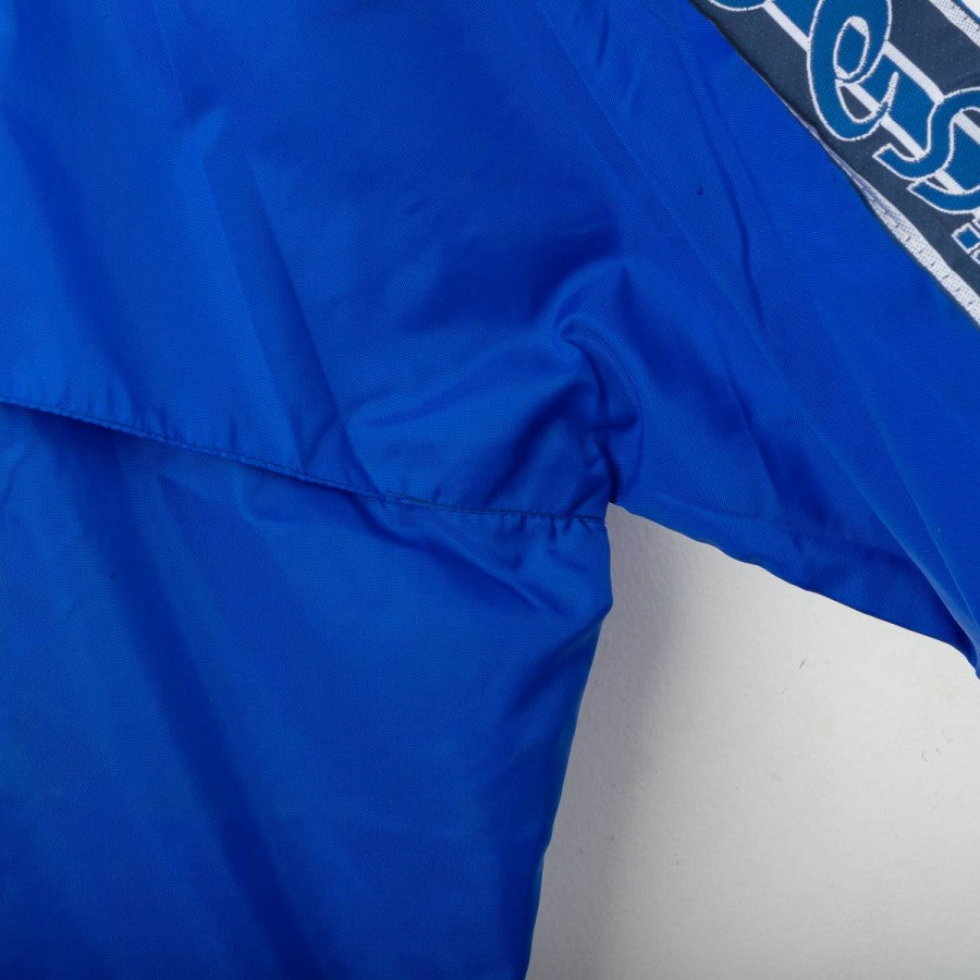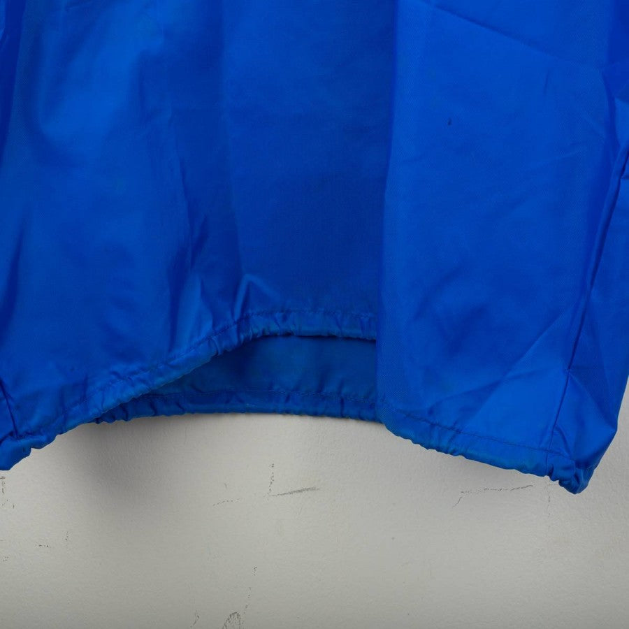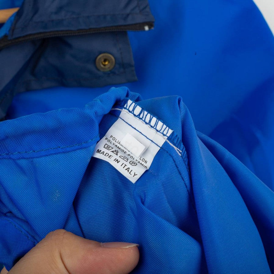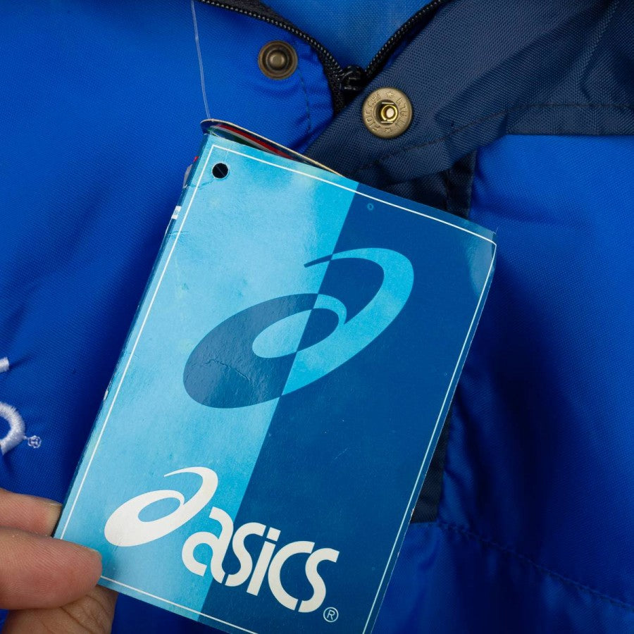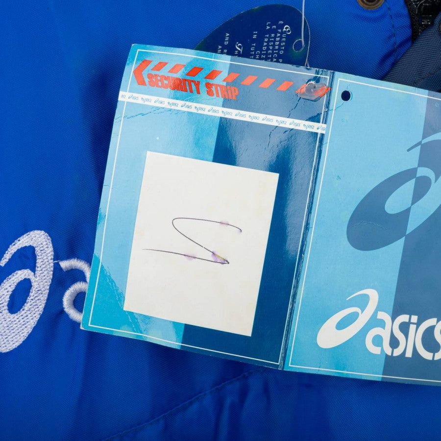 Official U.S. Lecce K-Way from the 1997/1998 season, made by Asics. Blue with white details and Asics logo tape along the sleeves. Embroidered white Asics logo on the right chest and on the back. Stitched Lecce crest on the left chest. “Banca Del Salento” sponsor printed in white on the front and back. High collar with snap buttons and half-zip front. Side pockets and adjustable hem. Original Asics label and tag still attached. Authentic vintage item from the 1997/1998 season.
