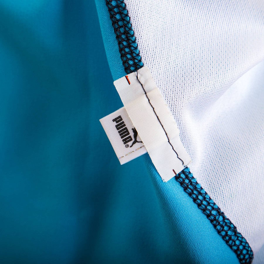 Lazio home match shirt, long sleeve version, from the 2004/2005 season with the name and number of Giuliano Giannichedda. The Lazio logo and the Italian Cup emblem are sewn on the front and the Puma Technical Sponsor is applied. Parmacotto commercial sponsor applied on the front part. The name and number Giannichedda 16 are printed on the back. On the right sleeve there is the Serie A patch. The shirt has some patches of grass as it was used by the player during a Serie A match.