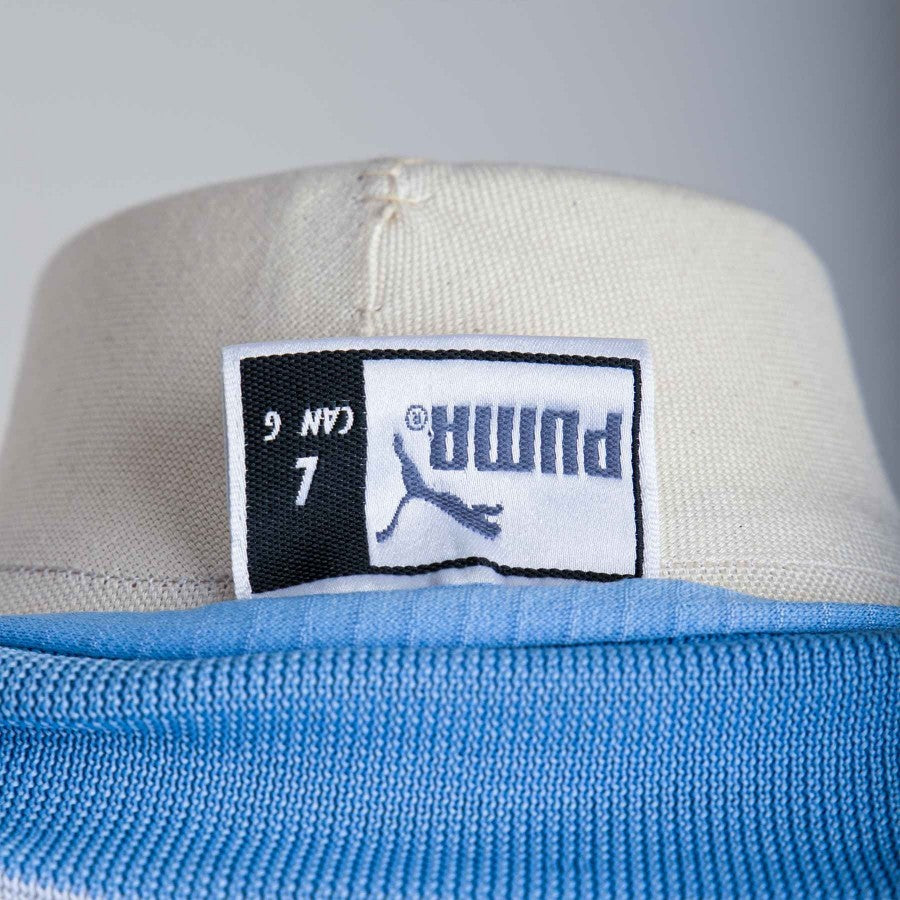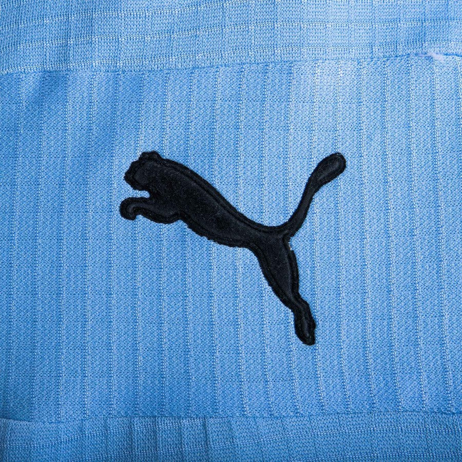 Lazio long-sleeved match shirt in light blue with inserts in blue and white. Present on the front of the uniform in flock logos Cirio, Puma and Lazio, as well as the sewn patch of the Italian Cup. On the back, also in flock, there is the SALAS lettering and number 9, while the SS.LAZIO writing is sewn on the back neck.