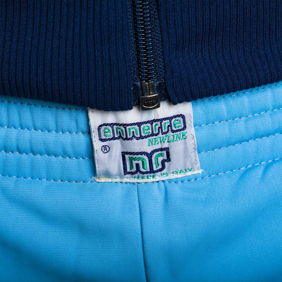 Lazio sky blue tracksuit with full zipper jacket and pants. On the front of the jacket with stitched ENNERRE and Lazio logos on the chest, in addition to the Castor logo painted on the front and back.